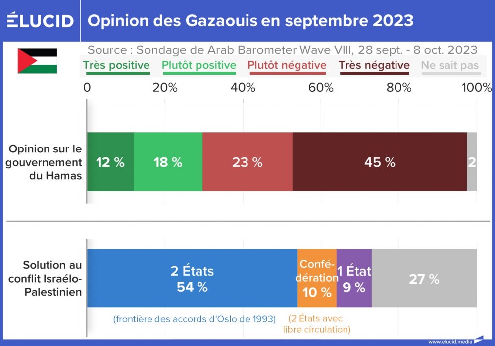 Le hasard a voulu qu’un large sondage ait eu lieu en Palestine en septembre 2023, avant les évènements dramatiques. Il a montré que les habitants de Gaza adoptaient majoritairement une attitude modérée : près de 70 % ne soutenaient pas le Hamas, et une majorité souhaitait une solution à 2 États.