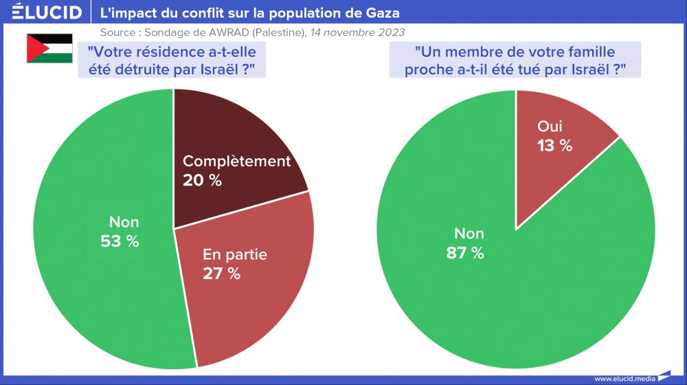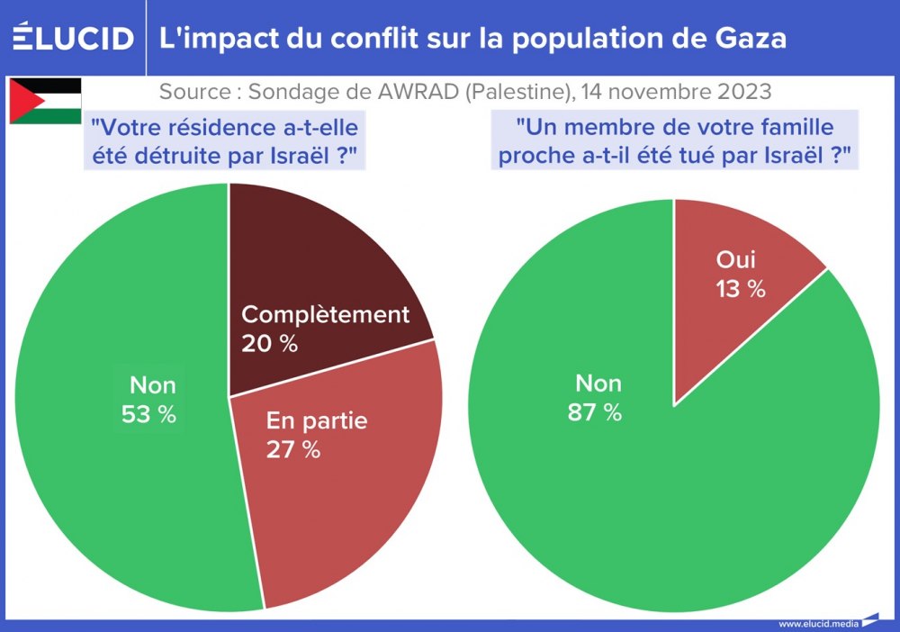Mais la riposte israélienne est alors survenue. Dans un autre sondage réalisé mi-novembre, près de la moitié des sondés avaient vu leur résidence détruite en tout ou en partie. Et plus de 10 % déclaraient avoir perdu un proche membre de leur famille, tué par Israël.