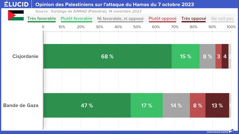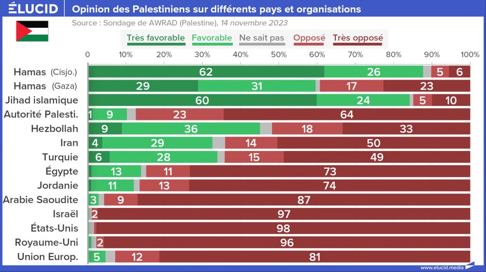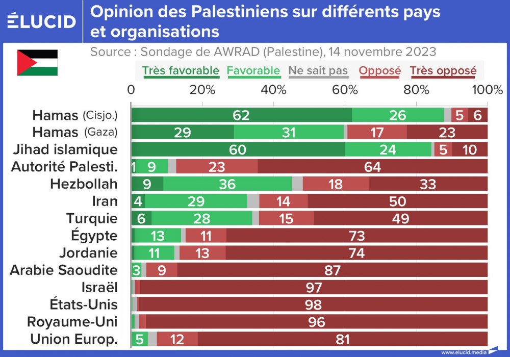 Enfin, plus de 95 % des Palestiniens se déclarent « très opposés » à Israël, aux États-Unis et au Royaume-Uni, l’Union européenne ne faisant guère mieux, avec seulement de 5 % d’opinions favorables.