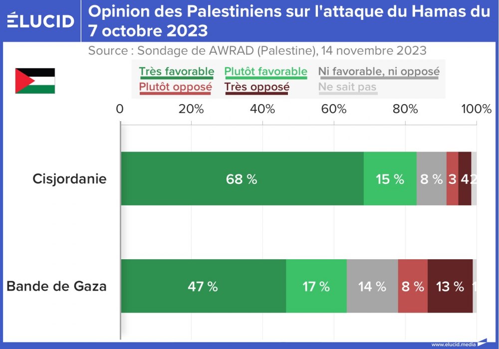 Dans ce contexte, la modération des Palestiniens a disparu : plus de 80 % des Palestiniens de Cisjordanie et plus de 60 % des Palestiniens de Gaza soutiennent désormais l’attaque du Hamas du 7 octobre.