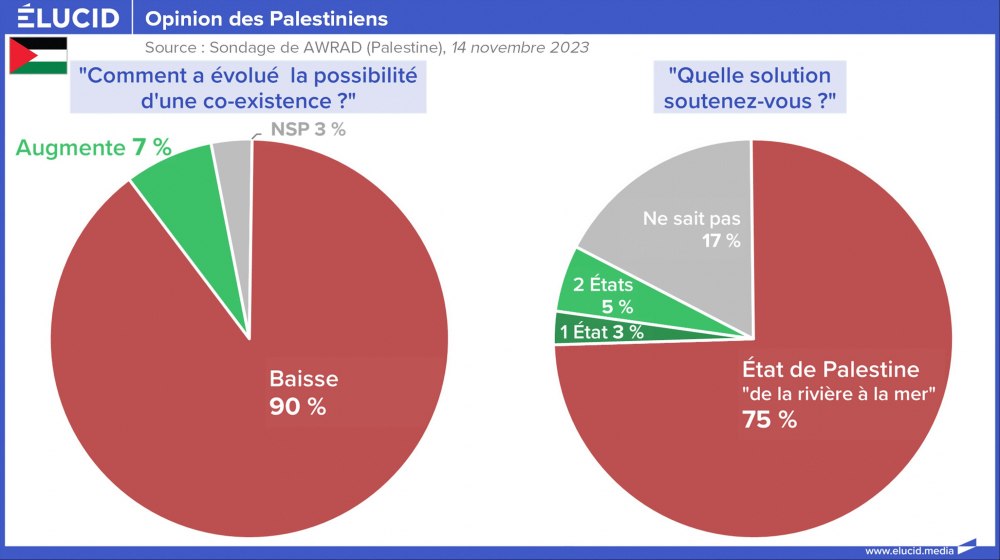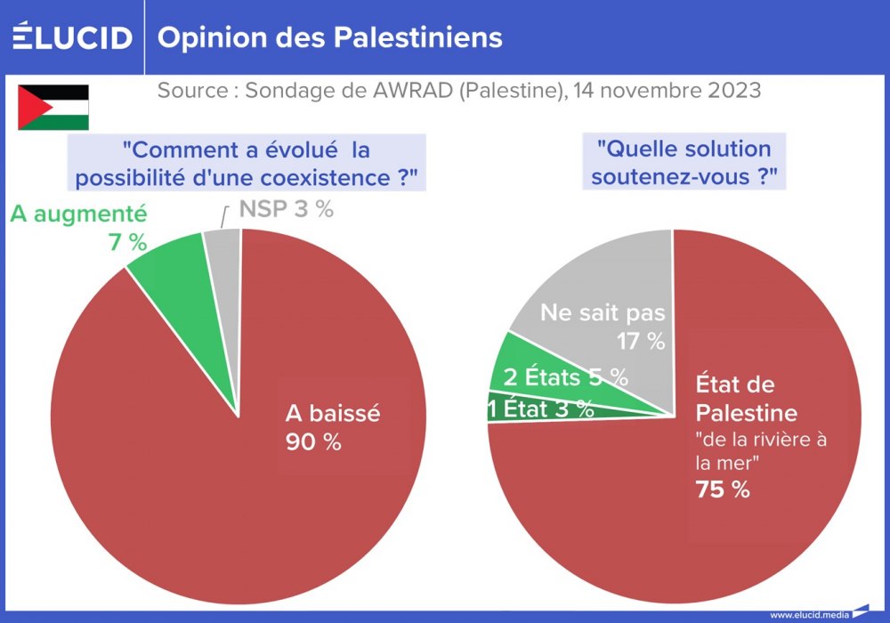 Sans surprise, les Palestiniens estiment à 90 % que la possibilité d’une coexistence a baissé depuis le début de la guerre. Et ils ne sont plus que 5 % à soutenir une solution à 2 États, préférant majoritairement un seul grand État palestinien remplaçant Israël.