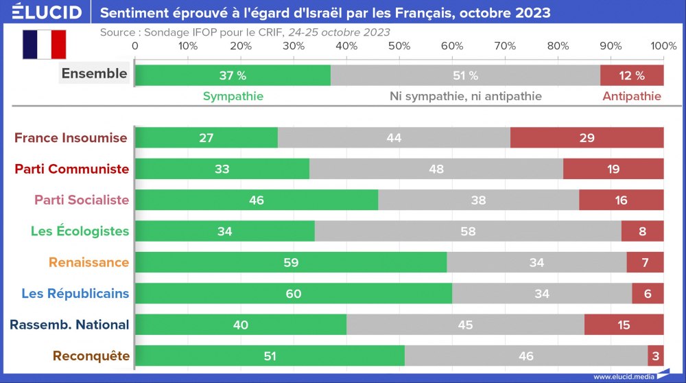 Quels changements dans l’opinion publique française ces scandaleux faits ont-ils induits ? Eh bien, en réalité, très peu. La sympathie envers Israël a baissé de 37 à 28 %, et l’antipathie a augmenté de 12 à 15 %. Il est difficile de savoir si ces faibles impacts sont dus à la propagande de masse des médias, à une compassion suite au massacre du 7 octobre ou à une simple conformation sociale, puisqu’à l’évidence, en France, pour ne pas avoir de problèmes, il vaut mieux soutenir Israël...