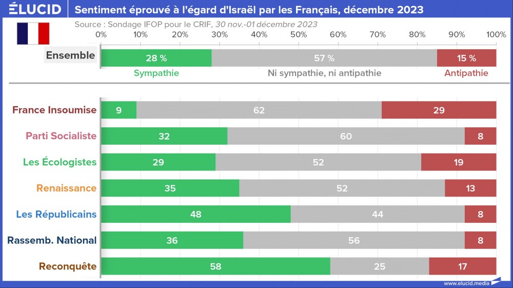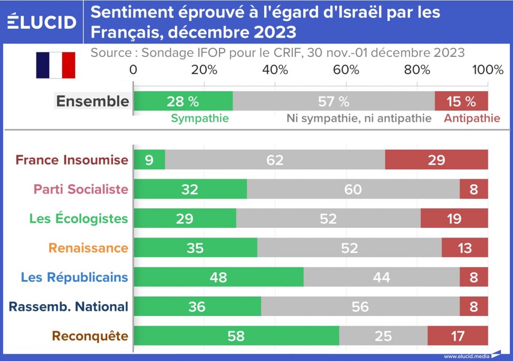La répartition par proximité partisane donne des résultats très intéressants. La sympathie est la plus forte à droite, de 50 % à 60 % chez Renaissance, les Républicains et Reconquête, suivis du Parti socialiste (qui, pour mémoire, a joué un rôle central dans la fabrication par Israël de la bombe atomique). Elle est la plus faible chez la France insoumise, le Parti communiste et les écologistes, autour de 30 %. L’antipathie augmente de 3 % chez Reconquête à 30 % chez les insoumis.