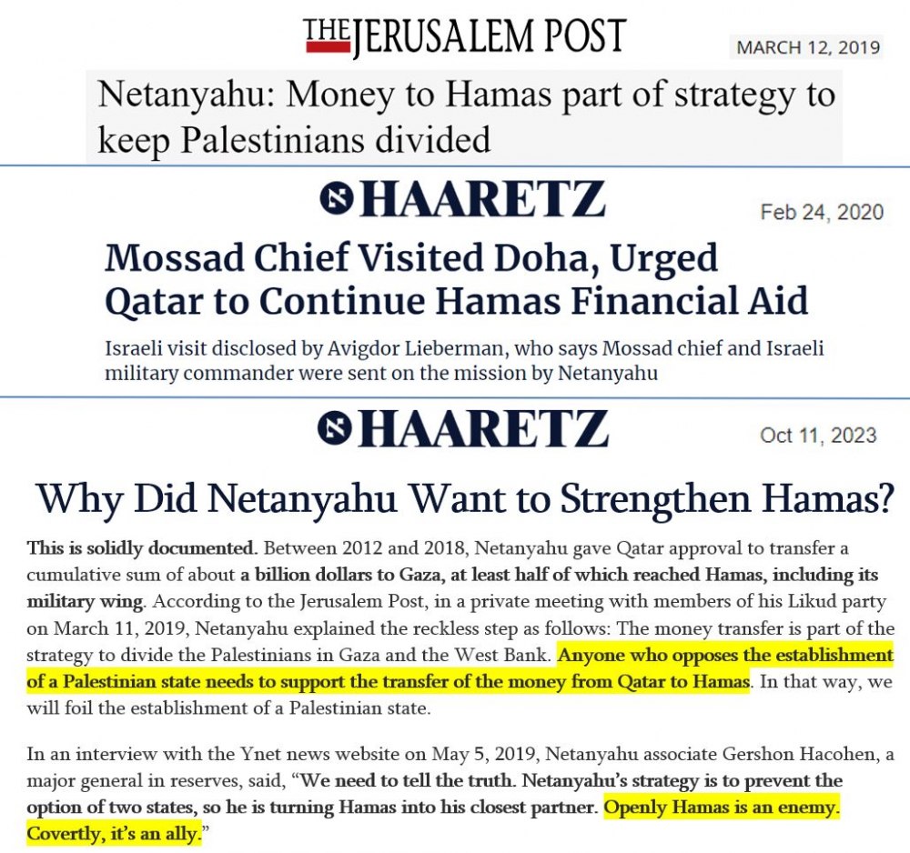 Le journal de la gauche israélienne Haaretz est d’ailleurs un des seuls à rappeler depuis des mois que, dans le but de diviser les Palestiniens pour empêcher un juste accord de paix, le gouvernement Netanyahou s’est démené pour que le Qatar continue à financer ce « mouvement reconnu comme terroriste en Occident », et c’était encore le cas en septembre 2023.