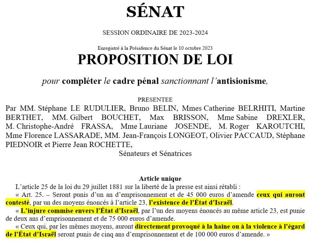 On comprend mieux, dans ce contexte, la volonté de certains parlementaires de faire taire toute critique d’Israël en assimilant antisémitisme et antisionisme, doctrine qui compte pourtant dans ses partisans les plus zélés bon nombre de célèbres antisémites rêvant que leurs concitoyens juifs déménagent à l’autre bout du continent. Par exemple, dans cette récente proposition de loi, des sénateurs veulent rendre passible de prison « la contestation de l’existence d’Israël », « l’injure envers Israël » ou « la provocation à la haine envers Israël ».