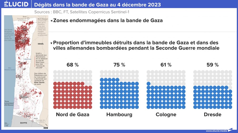 En conséquence, selon une analyse de photos satellites réalisée par le Financial Times, environ 100 000 logements sont en ruines, près de 70 % des habitations ont été détruites ou endommagées, soit un niveau comparable aux pires bombardements sur des civils en Allemagne durant la Seconde Guerre mondiale, dont l’horreur avait entrainé la signature des Conventions de Genève en 1949 et 1977, au nom du « plus jamais ça ».