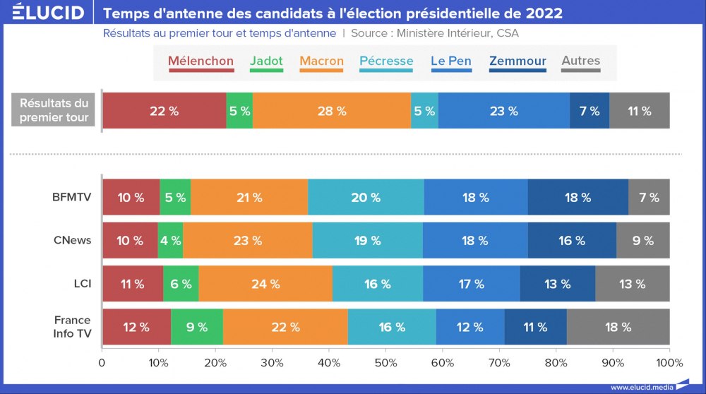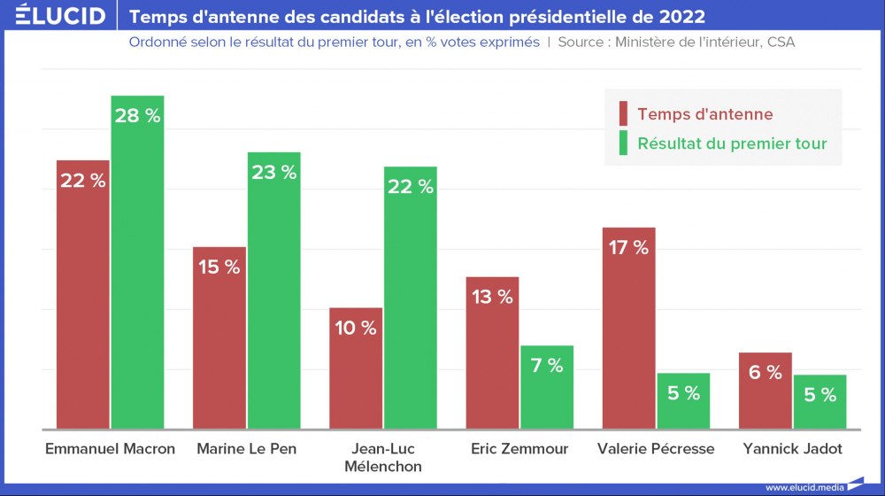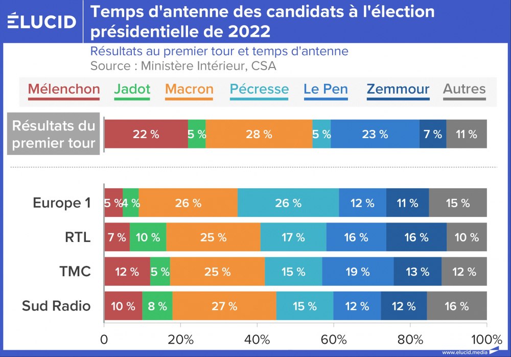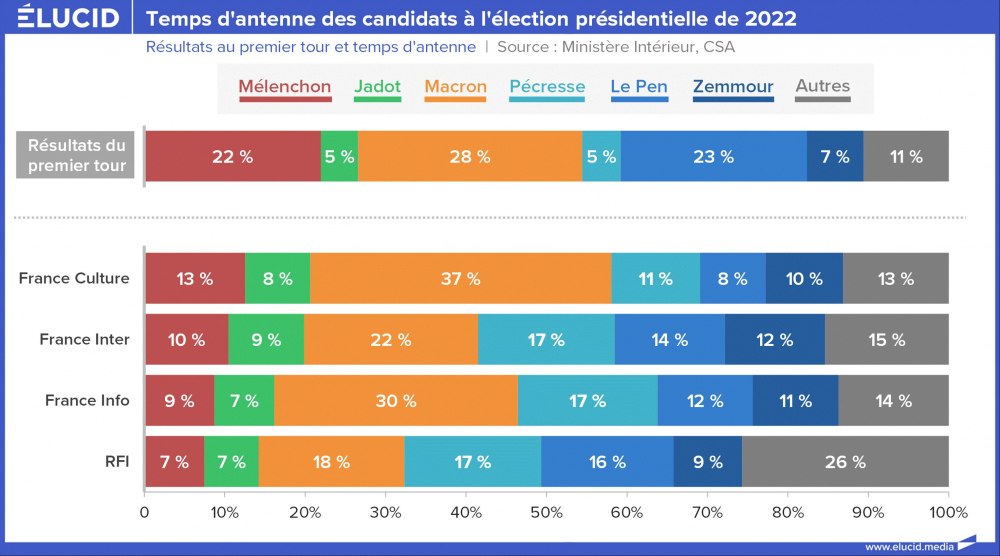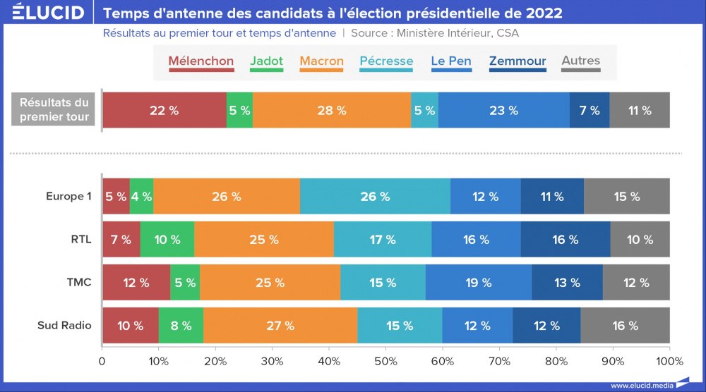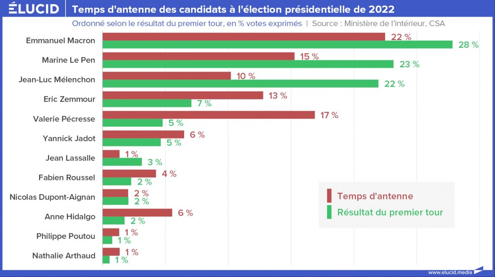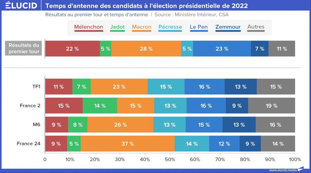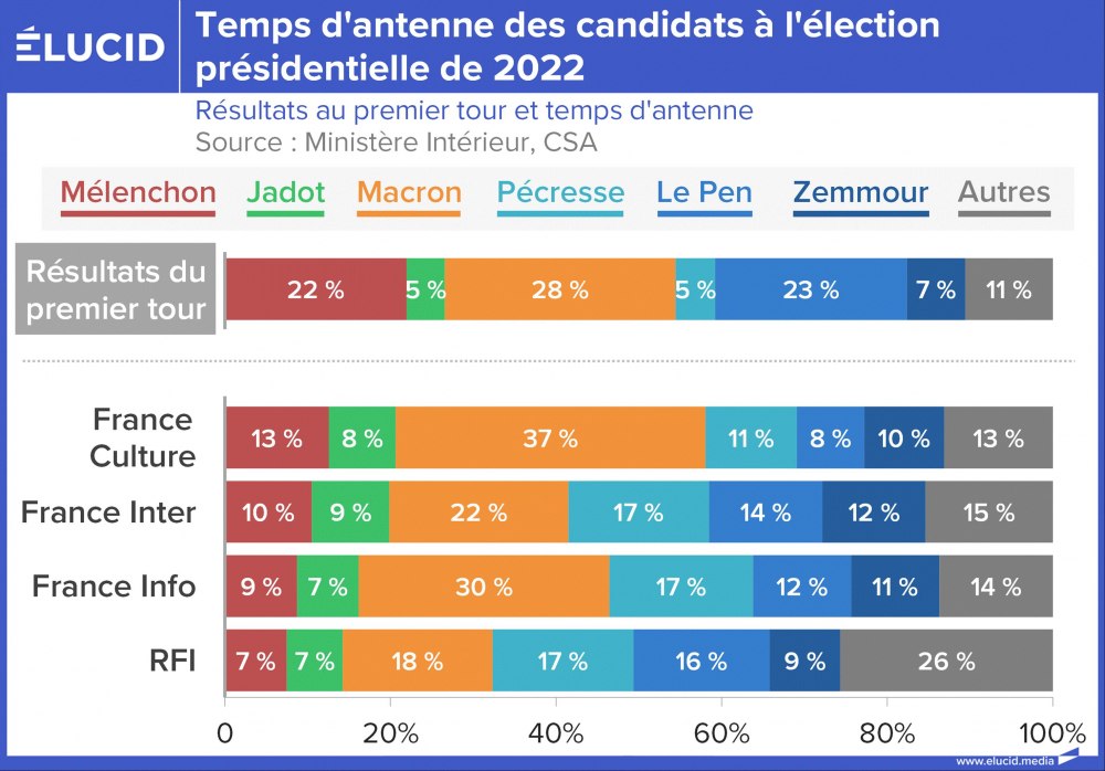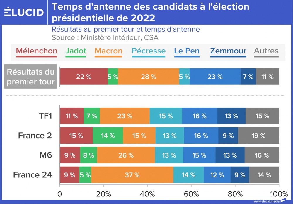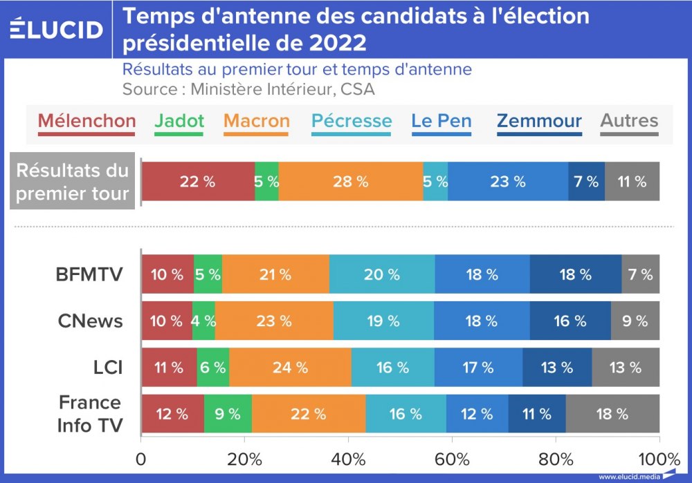 A contrario, Jean-Luc Mélenchon, gros candidat sensé répondre favorablement aux deux premiers critères de représentativité de l'Arcom, a été sous-exposé médiatiquement de manière assez impressionnante : seulement 10 % de temps d’antenne (moins qu’Éric Zemmour) pour un résultat de 23% ! C’est également le cas pour la candidate du RN Marine Le Pen. Soit, les deux premiers partis d’opposition du pays.