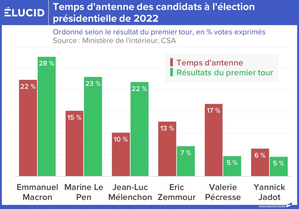 L’exemple le plus flagrant est Valérie Pécresse avec 17 % d’exposition médiatique, contre seulement un résultat de 5 %.... Mais ce fut également le cas pour Éric Zemmour, un « nouveau candidat » très apprécié par les médias qui a bénéficié de 13% d’exposition contre un résultat de 7 %. Dans le même esprit, nous pourrions citer la performance chaotique d’Anne Hidalgo.