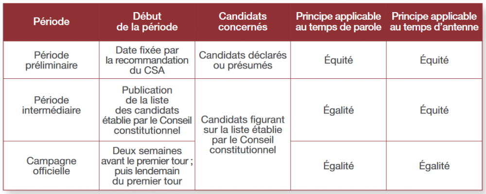 - Entre le 8 et le 27 mars : à partir de la publication de la liste officielle des candidats, il y a une application d’un principe renforcé d’équité « dans des conditions de programmation comparable ». Autrement dit, les médias n’ont pas le droit de magouiller en diffusant les candidats qu’ils n’apprécient guère à 3h du matin, ces derniers doivent être visible à des heures de programmation similaires.