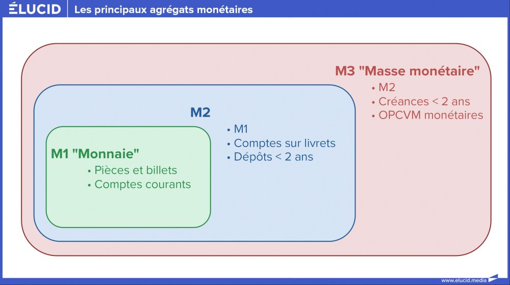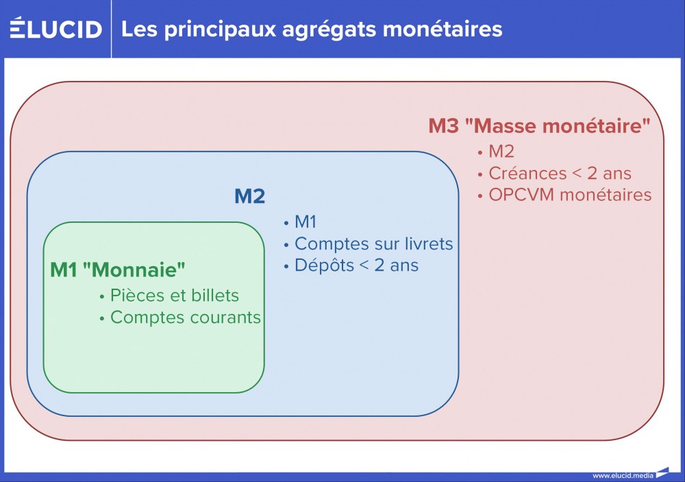 Au fil du temps, les banques centrales ont défini des instruments de mesure de la monnaie, appelés « agrégats monétaires ». Ces différentes « masses monétaires » dépendent en effet de la définition retenue de la monnaie. Il y en a trois principales, qui s’emboitent comme des poupées russes :