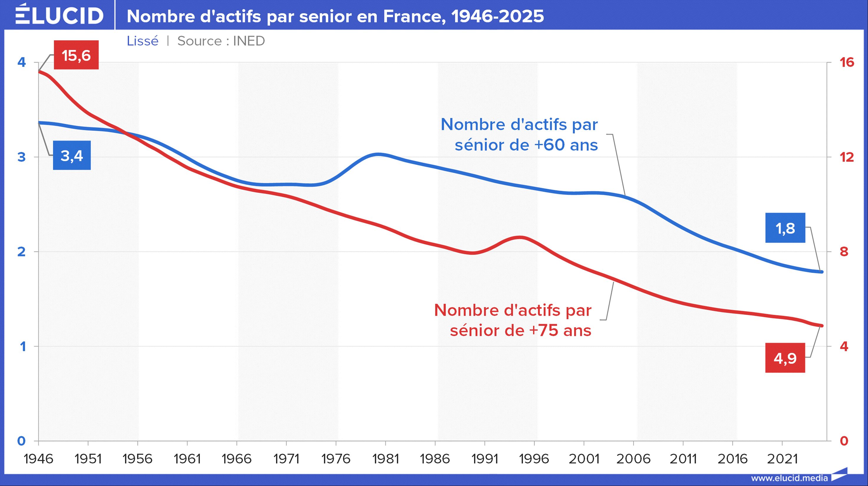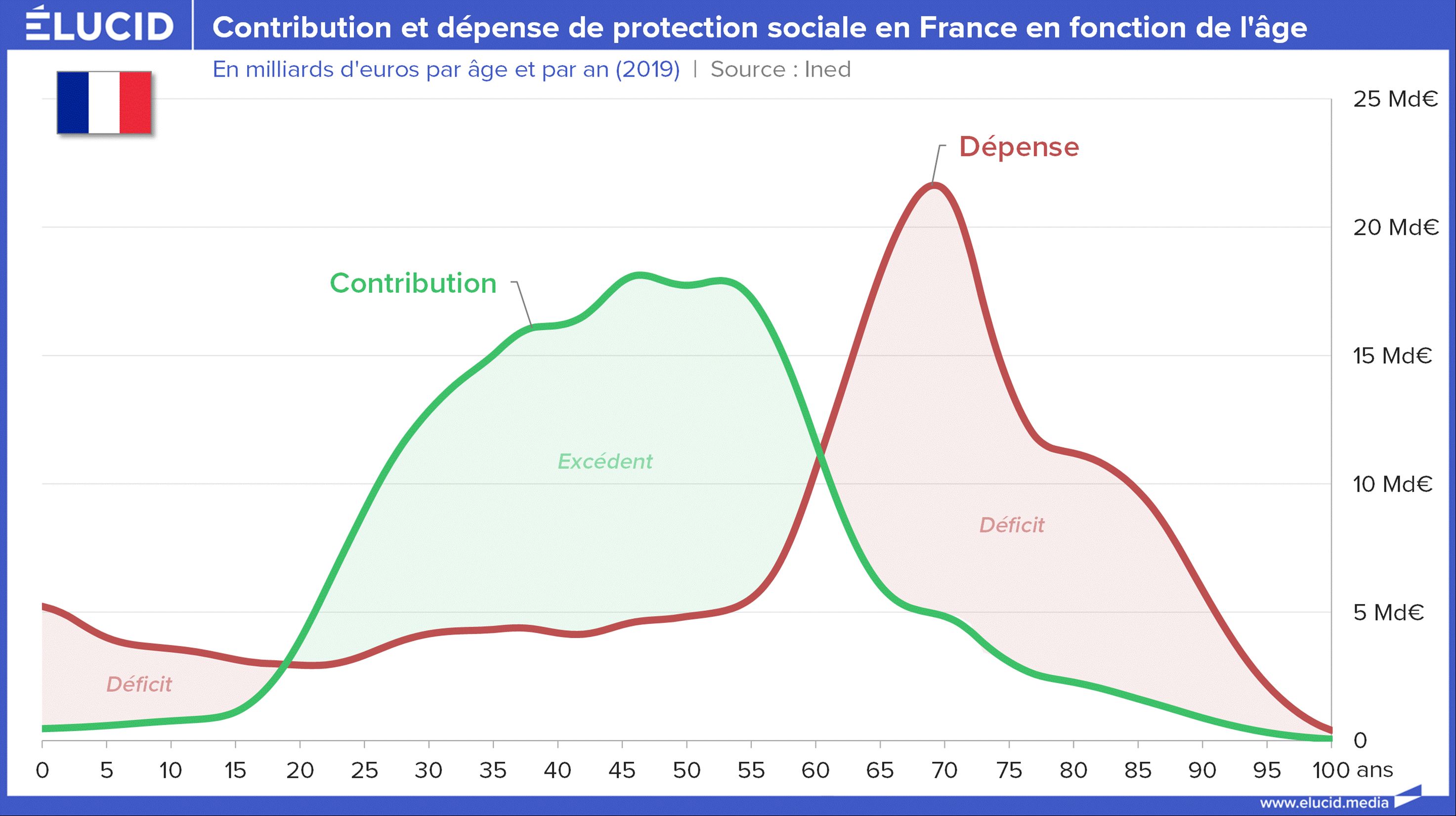 Mais la logique s’inverse totalement si l’on regarde les prestations reçues : un actif « consomme » environ 400 € de dépenses sociales par mois, alors qu’un retraité en reçoit en moyenne 2 500 € par mois (principalement via sa pension de retraite et les frais de santé). En fin de vie, ce chiffre approche même 3 000 € par mois, sans compter les cas de maladie longue durée.