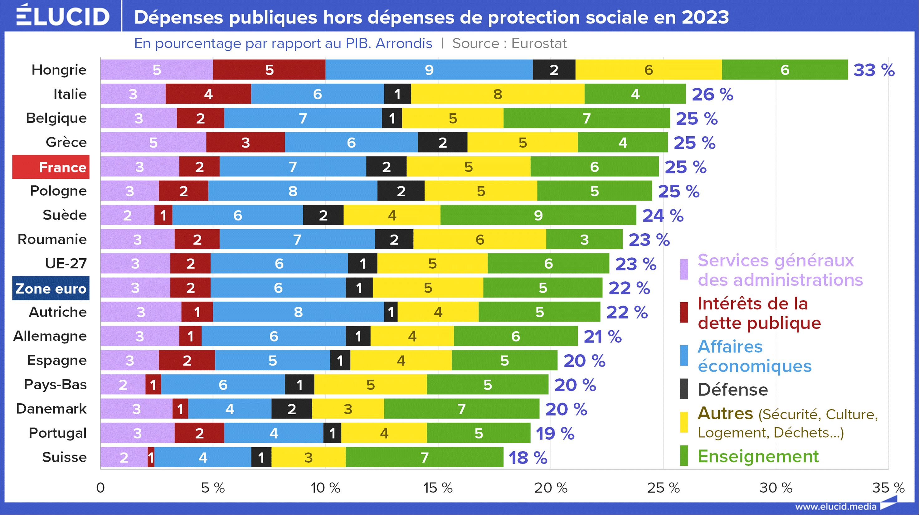 - 0,2 point de moins pour l’administration générale et la sécurité, qui sont donc à peu près équivalentes entre les deux pays.