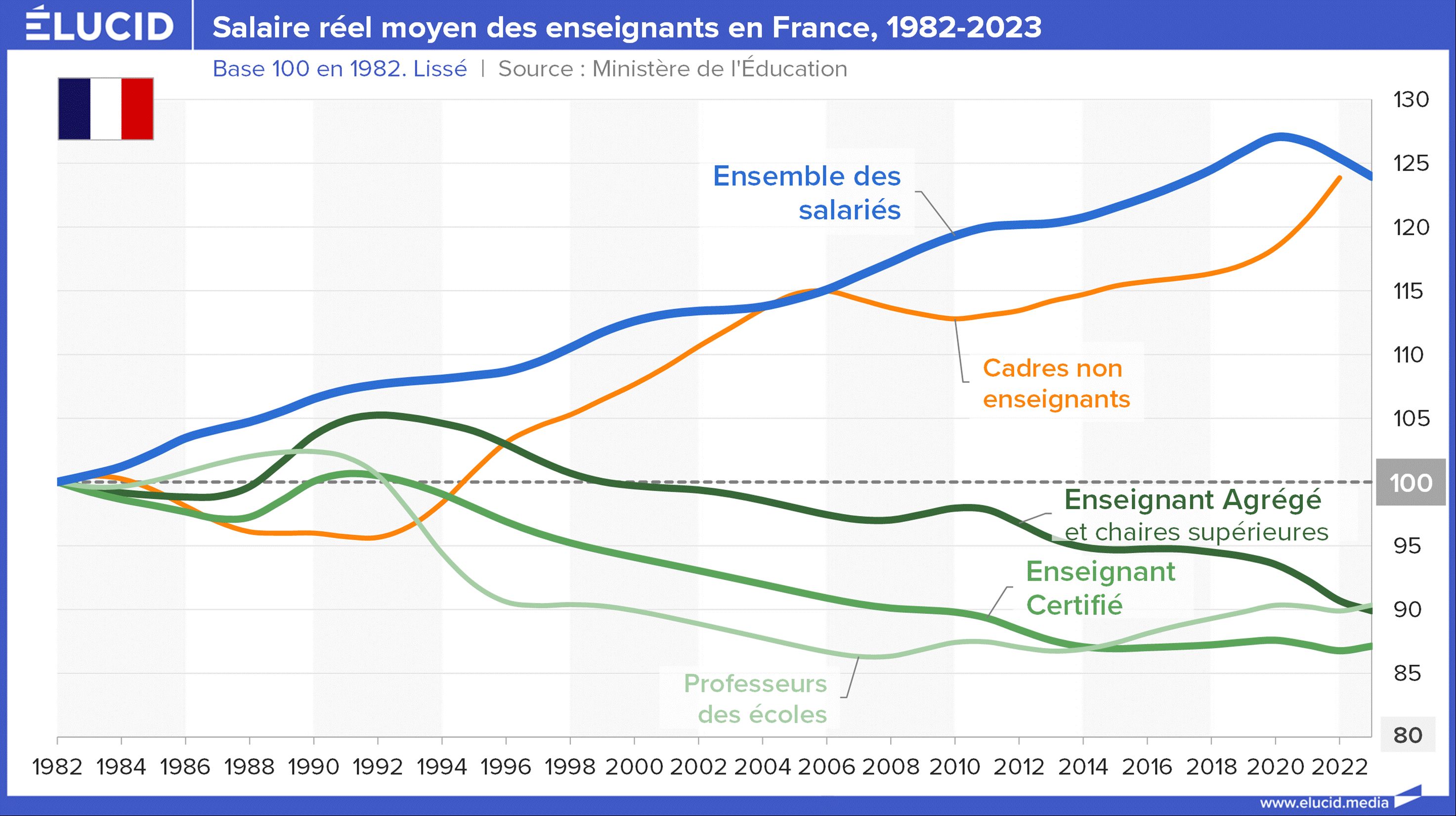 Le poste éducation est également plus élevé en France. Comme ailleurs, il souffre de problèmes de gestion, mais surtout de sous-investissement. Cela explique la baisse dramatique de la rémunération des enseignants depuis 40 ans, qui se traduit sans surprise par une désaffection croissante pour le métier et donc une baisse inquiétante du niveau de recrutement des professeurs.