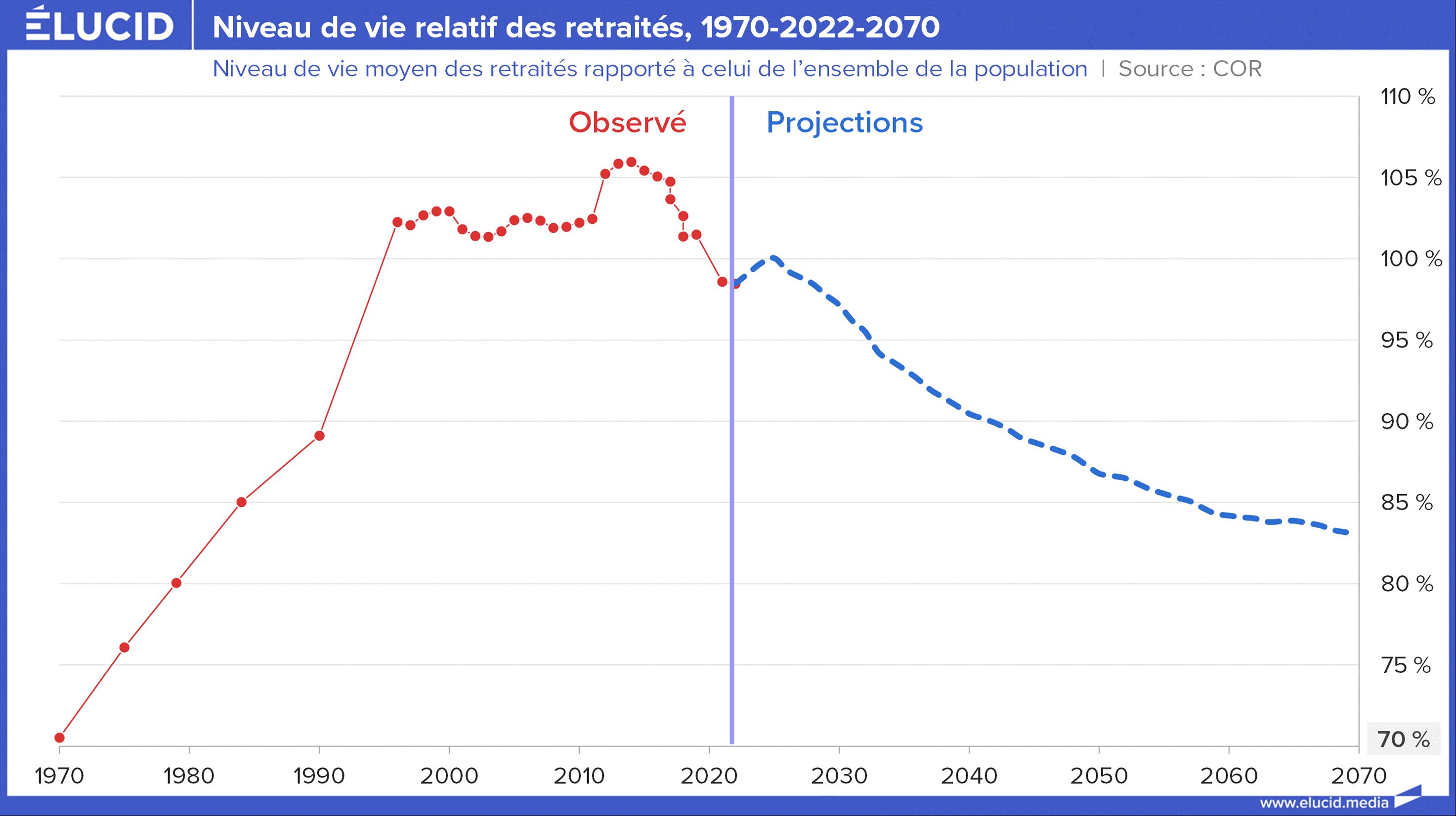 À la place, les réformes des retraites se succèdent pour limiter les dépenses. En conséquence, le montant total des pensions stagne (voire diminue en euros constants depuis 2014) en dépit de l’arrivée massive de nouveaux retraités. Concrètement, cela signifie que la pension moyenne, relativement au revenu des actifs, est déjà un peu plus basse qu’il y a 10 ans, et elle va continuer à baisser. Le Conseil d’Orientation des Retraites (COR) prévoit ainsi dans l’un de ses derniers rapports que, malgré l’explosion à venir du nombre de retraités, la part de richesse allouée aux retraites va baisser de 10 % dans les décennies à venir. Autrement dit, les retraités vont s’appauvrir par rapport au reste de la population.