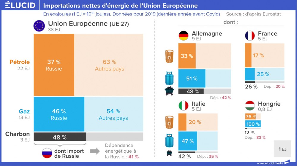 Ces importations proviennent d’énergies fossiles : 22 EJ de pétrole, 13 EJ de gaz et 3 EJ de charbon. Sur ce total, 41 % de notre énergie importée venait de la Russie en 2019, ce qui représentait le quart de toute l’énergie consommée dans l’UE. La dépendance est particulièrement forte pour le gaz (plus difficilement remplaçable que le pétrole), surtout pour des pays comme l’Allemagne, l’Italie ou la Hongrie. Nous allons voir pourquoi.