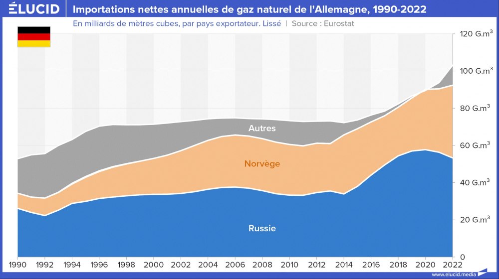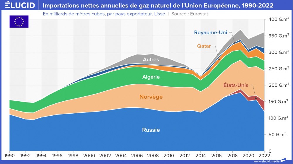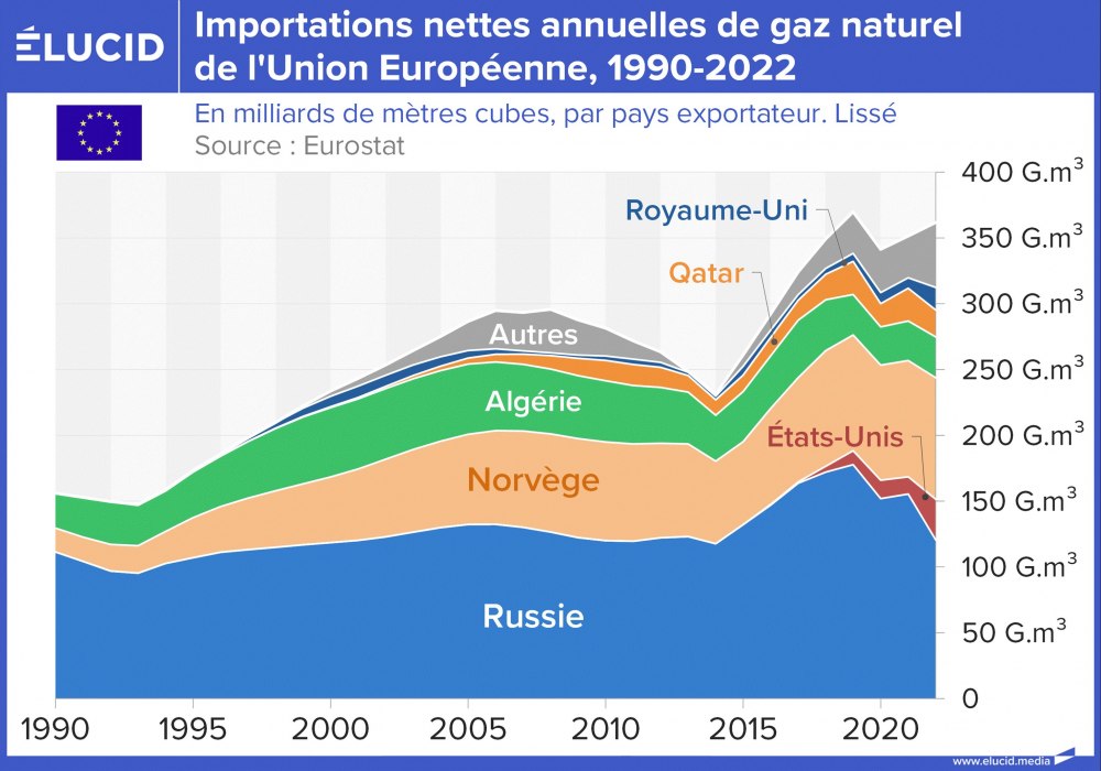 La consommation de gaz a augmenté de plus d’un tiers, pendant que la production européenne a baissé des deux tiers : en conséquence, entre 1990 et 2022, les importations de gaz naturel dans l’UE ont plus que doublé (+ 140 %) ; elles représentent désormais plus de la moitié de l’énergie obtenue du pétrole.