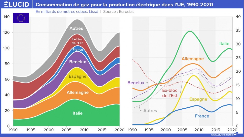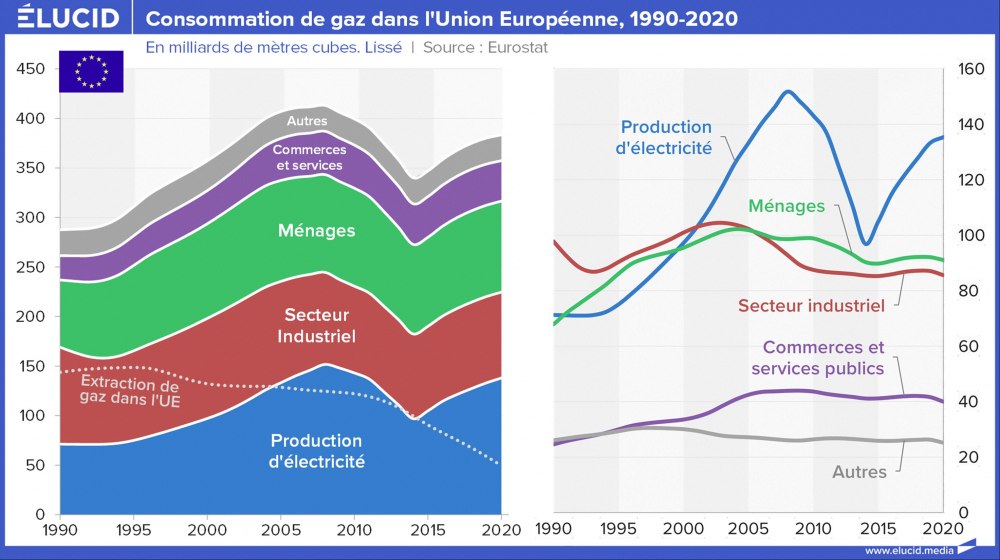 La consommation de gaz de l’UE a nettement augmenté, passant de près de 300 Gm3 à 380 Gm3 en 30 ans, avec de larges fluctuations causées par l’utilisation du gaz dans le but de produire de l’électricité, qui ne représente pourtant que le tiers de la consommation. Cette situation a été compliquée par le fait que la production de gaz dans l’Union européenne (en particulier aux Pays-Bas) n’a cessé de décroitre, baissant de près de 70 % durant ces trois dernières décennies.