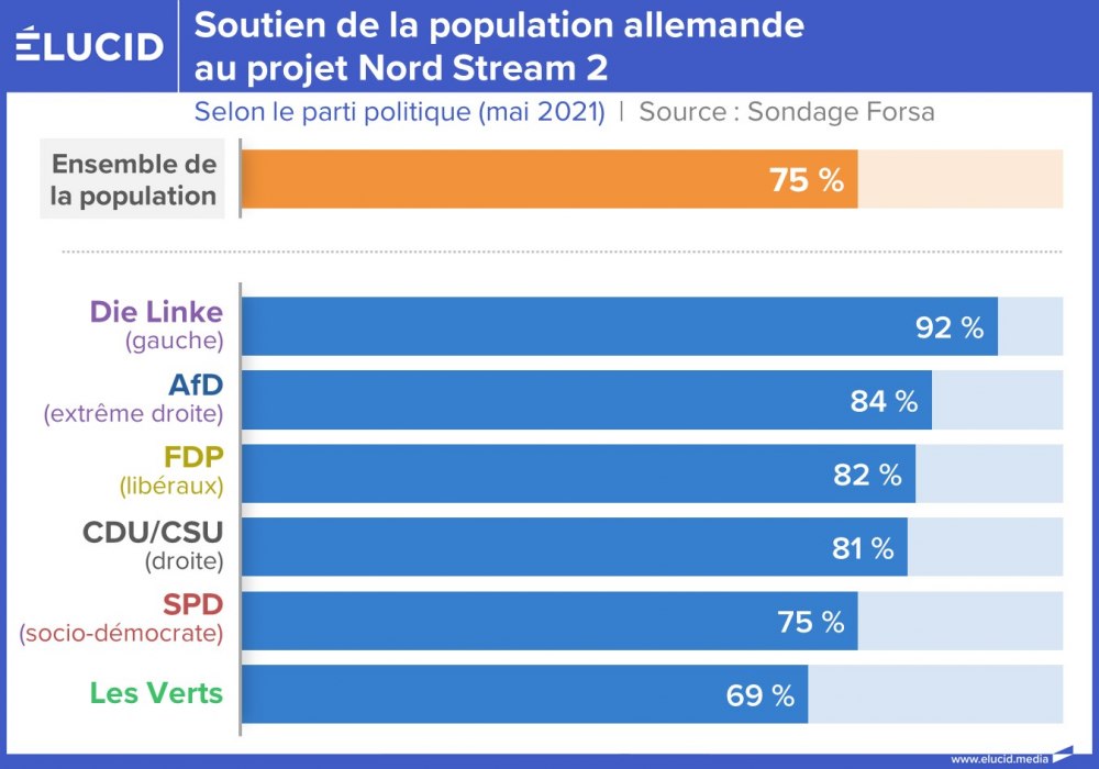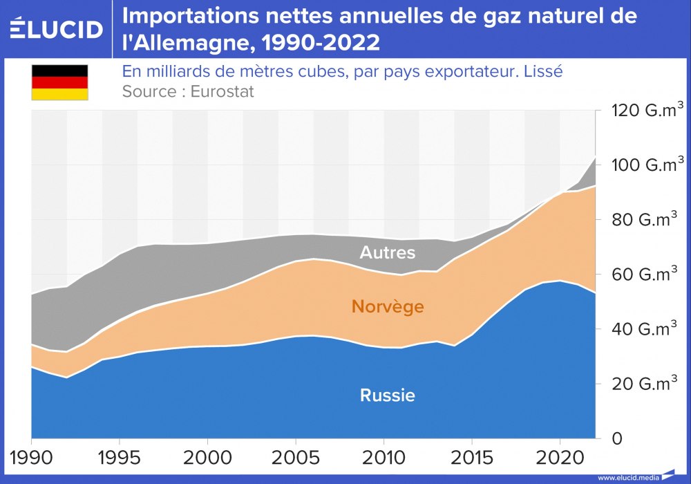 Ceci étant précisé, il convient de rappeler notre propos initial : le gaz est une source d’énergie hautement stratégique pour l’Allemagne, sur lequel elle a en partie bâti sa prospérité. Il représente 40 % de toute l’énergie importée par l’Allemagne, la moitié du gaz allemand venant de Russie. Elle a donc beaucoup œuvré pour sécuriser ses approvisionnements, en particulier avec le projet Nord Stream.