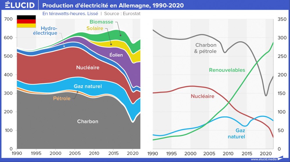 On constate que l’Allemagne a en effet dû faire face à une chute drastique de la production nucléaire, mais également de la production issue du charbon. Pour compenser cette chute, elle a fortement développé sa production d'énergies renouvelables, à commencer par l’éolien, et ce de façon impressionnante comparée à la France.