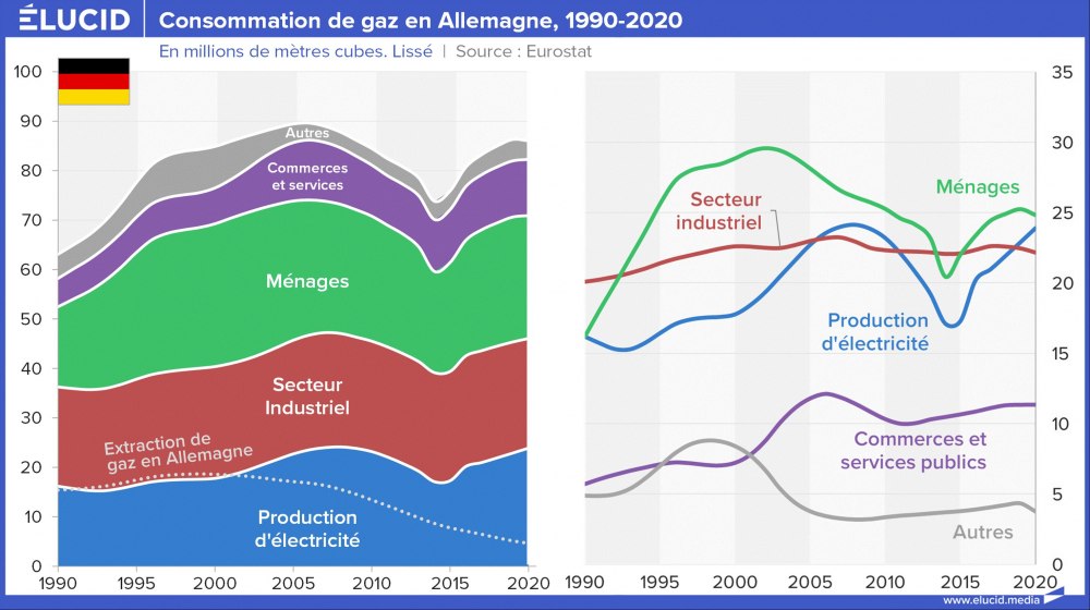 Il y a d’autres idées reçues sur le gaz allemand. On imagine que l’Allemagne utilise surtout son gaz pour la production électrique, alors qu’elle représente moins du tiers de la consommation. On entend aussi parfois que l’Allemagne aurait été obligée d’acheter plus de gaz pour compenser sa sortie du nucléaire.