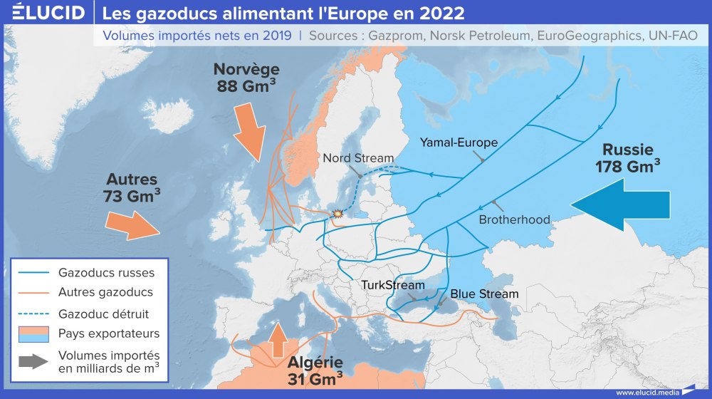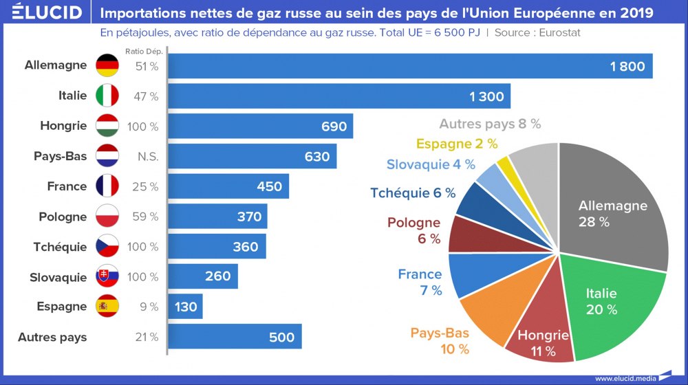 Jusqu’en 2022, la Russie était, de loin, le premier fournisseur de gaz de l’UE, devant la Norvège. Au niveau des clients de la Russie, l’Allemagne était le premier client de la Russie, devant l’Italie et la Hongrie. Le taux de dépendance énergétique est particulièrement fort dans les anciens pays du bloc de l’Est, qui obtenaient du gaz soviétique à bas coût. Mais pour ces derniers, les quantités étaient faibles : 7 Gm3 d’exportations totales en 1973 contre environ 170 Gm3 pour l’UE en 2019, représentant cette année-là une somme de 18 Md€, soit 10 % de toutes nos importations de Russie.