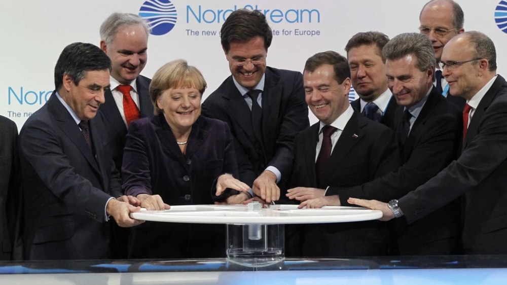 Au temps de la concorde européenne : cérémonie d’inauguration du gazoduc Nord Stream 1 le 8 novembre 2011, avec la Chancelière allemande Angela Merkel, la Président russe Dimitri Medvedev, le Premier ministre français François Fillon et le Premier ministre néerlandais Mark Rutte. Source : Wikipédia
