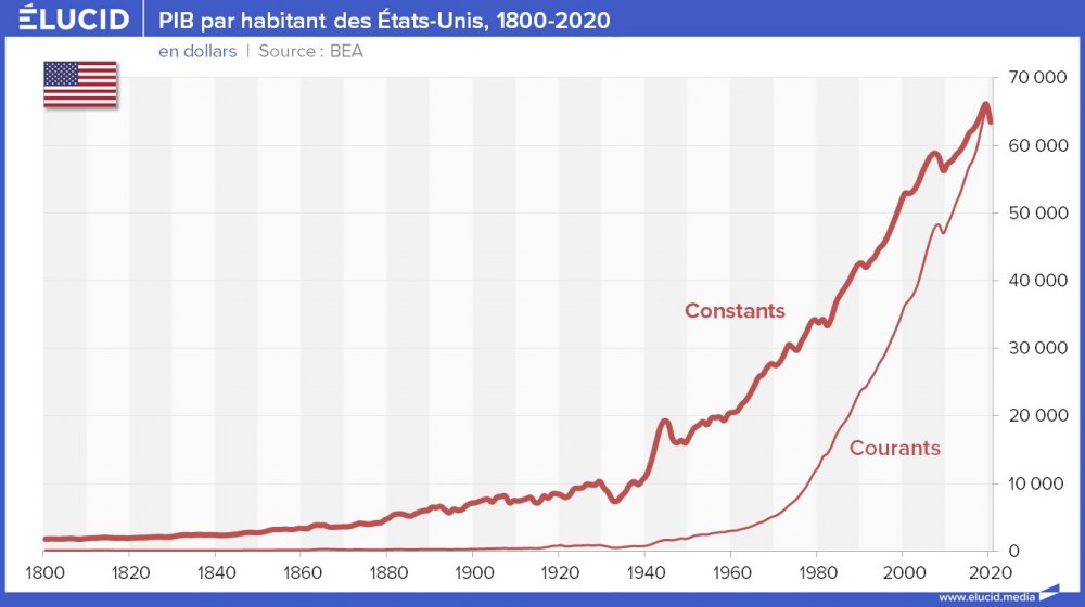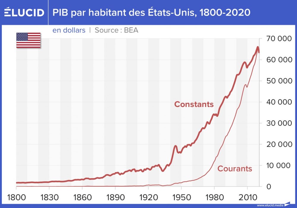En intégrant le facteur démographique dans la mesure de la croissance américaine, on se rend compte que le PIB par habitant a augmenté de manière très importante à partir de la fin des années 1930. Corrigé de l’inflation, le PIB annuel par habitant américain est ainsi passé de 17 000 dollars en 1950 à 65 000 dollars en 2019, soit une multiplication par près de quatre. Il s’établit à 63 400 dollars en 2020.