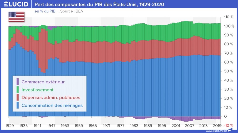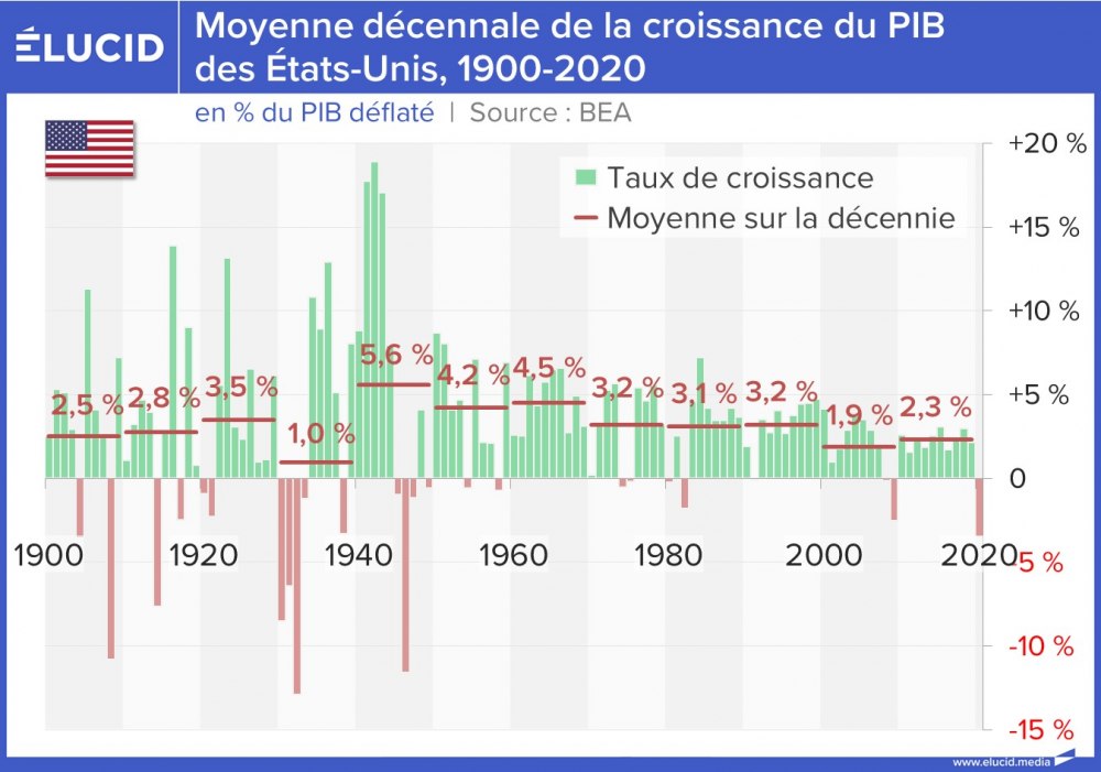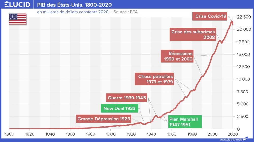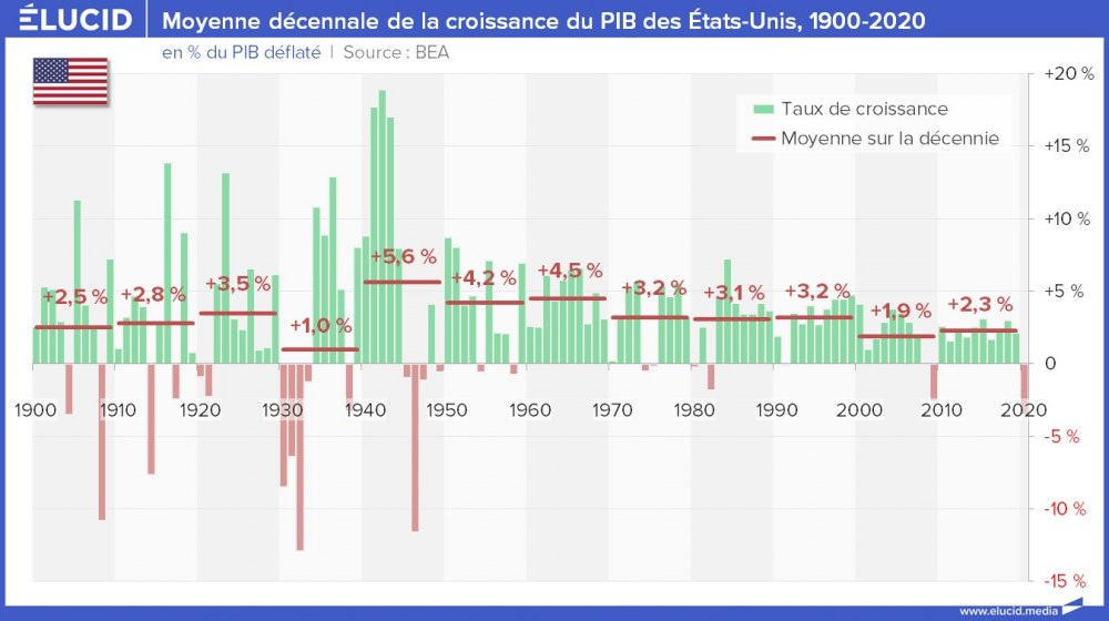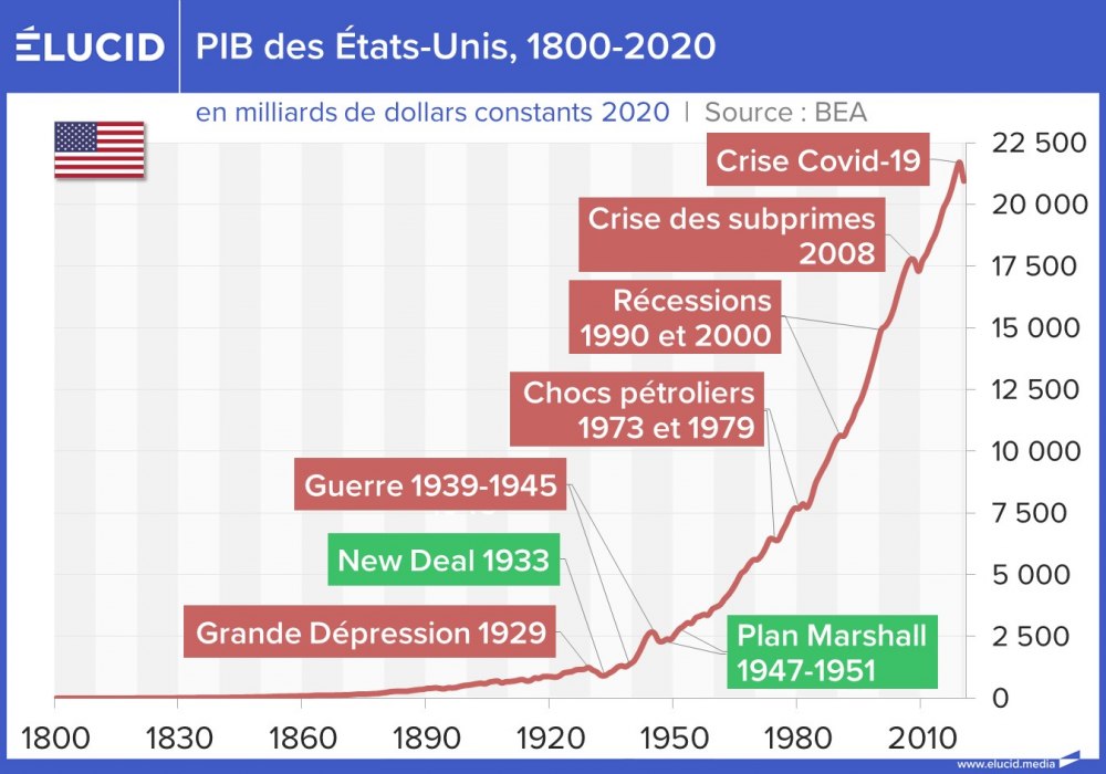 À noter que le « New Deal » initié par le président Franklin Delano Roosevelt entre 1933 et 1938 permet de relancer la croissance américaine dans la deuxième moitié des années 1930. Mais c’est dans les années 1940, avec la mise en place d’une économie de guerre, que les États-Unis vont connaître leur période de croissance la plus faste.