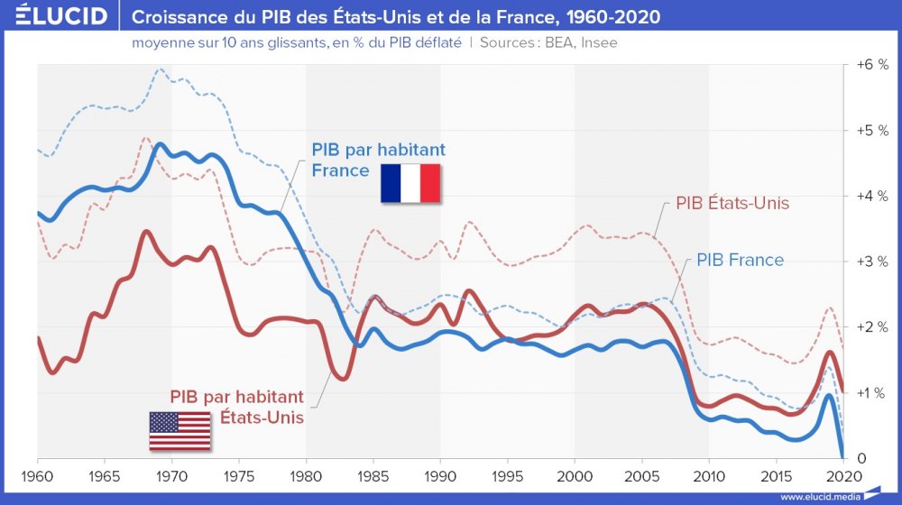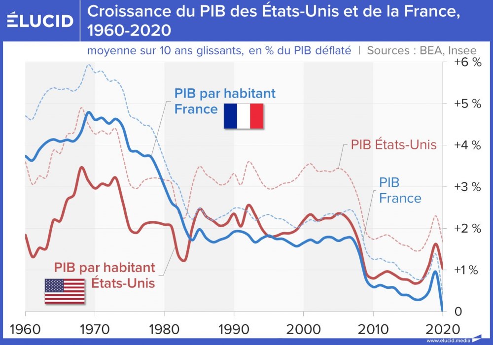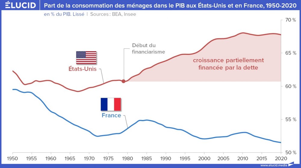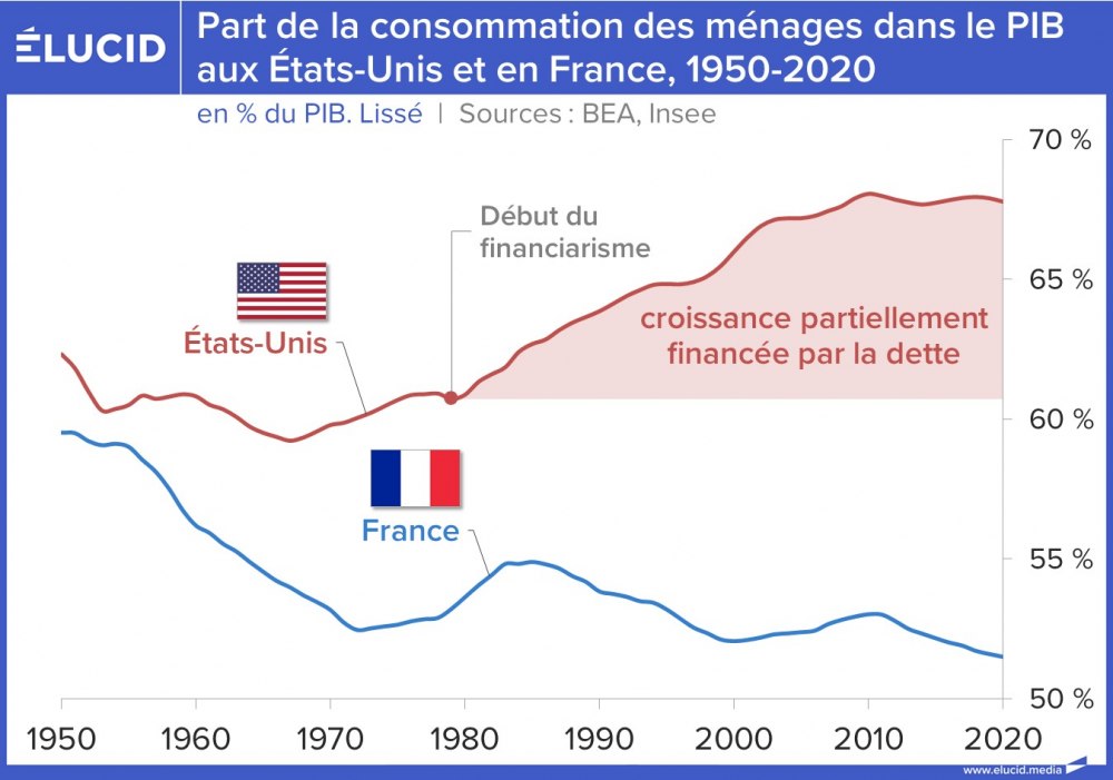 Finalement, la croissance américaine a donc ralenti au XXIe siècle, après soixante années de très forte augmentation tirée par la consommation des ménages, qui se sont endettés pour cela. À partir de la fin des « trente glorieuses », la croissance du PIB français est devenue inférieure à celle des États-Unis, qui a été maintenue à flot par la consommation à crédit et le financiarisme.
