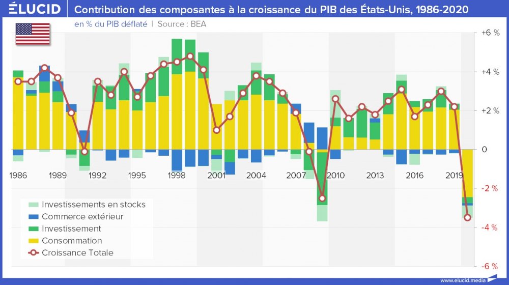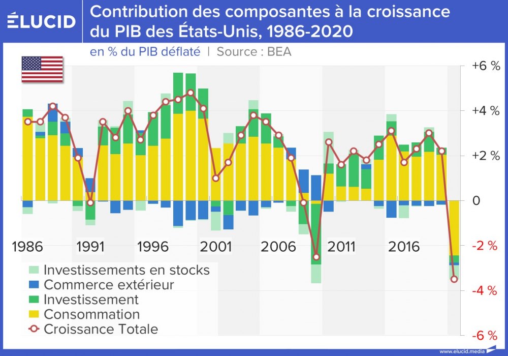 Enfin, entre 2010 et début 2020, la croissance américaine repart : le pays connaît 126 mois de croissance consécutifs jusqu’au début de la pandémie mondiale de Covid-19. En 2020, la récession aux États-Unis fait varier négativement le PIB de 3,5 %, un niveau plus important qu’en 2009.