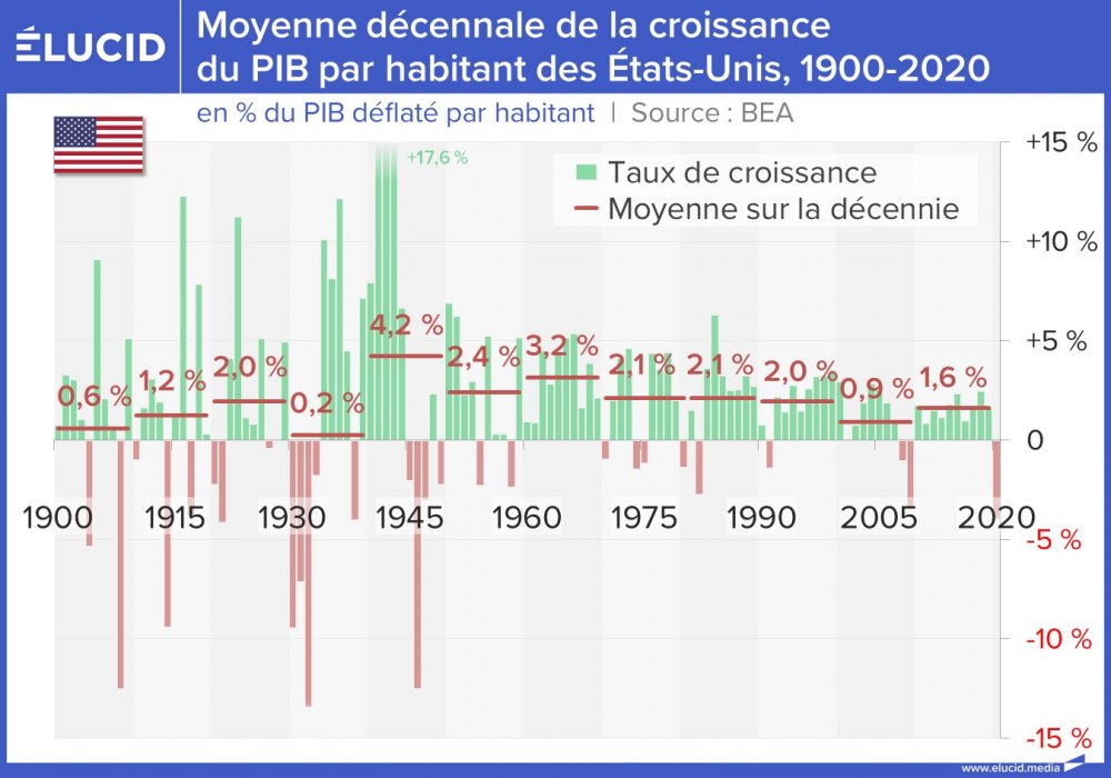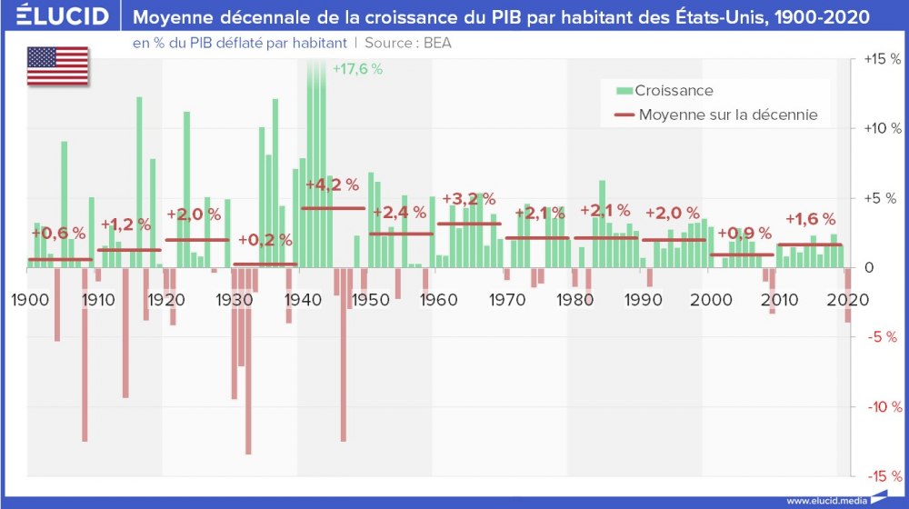 - - Si l’on considère sa croissance annuelle moyenne par décennie, la croissance du PIB par habitant était ainsi très faible au début du XXe siècle, ne dépassait pas 2 %.