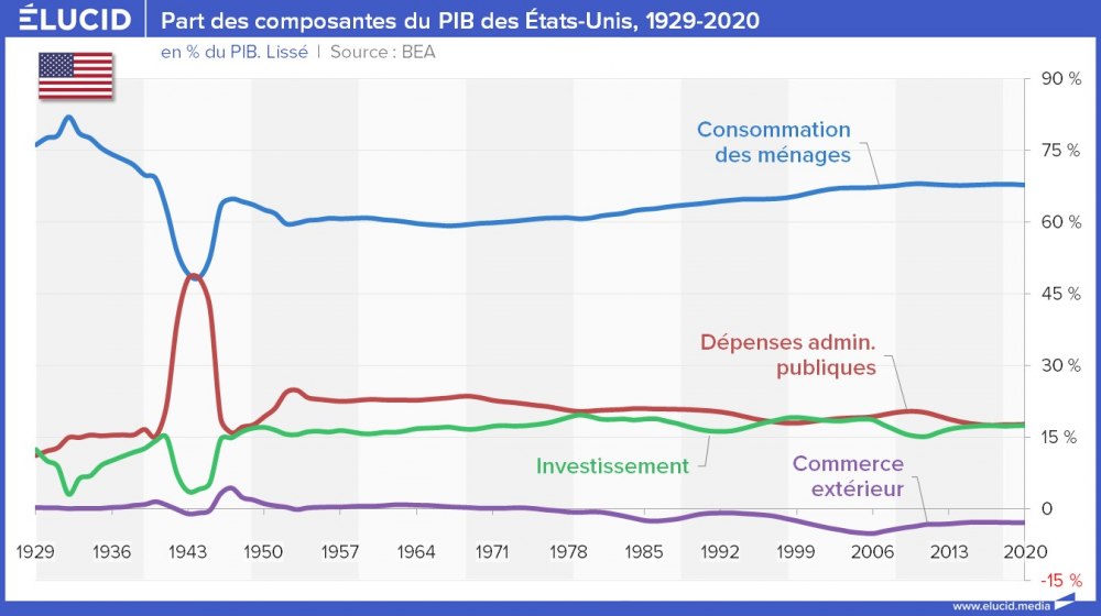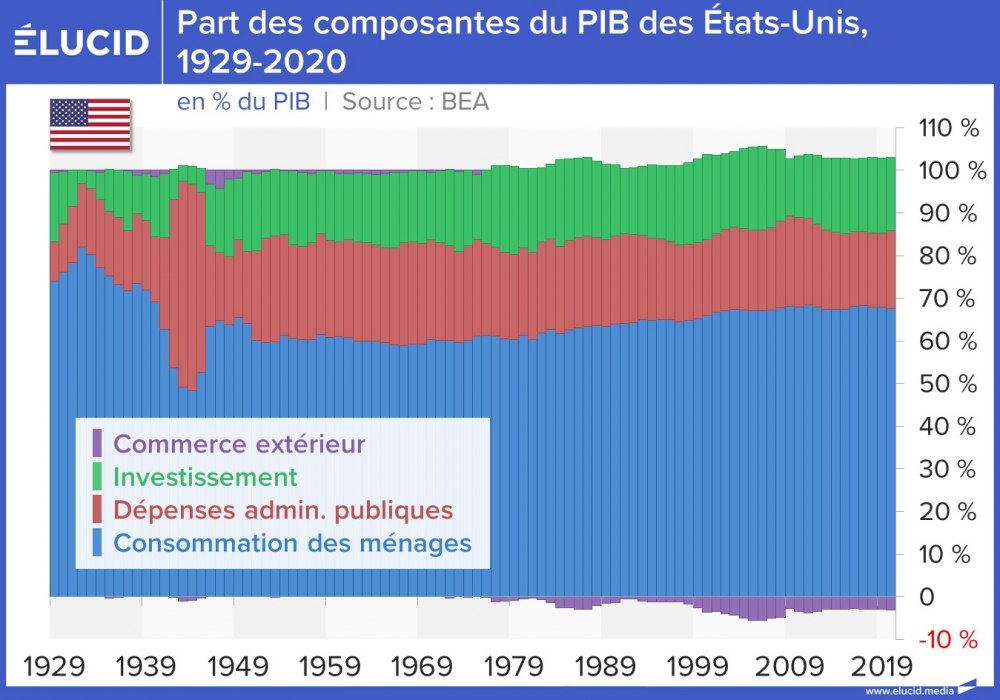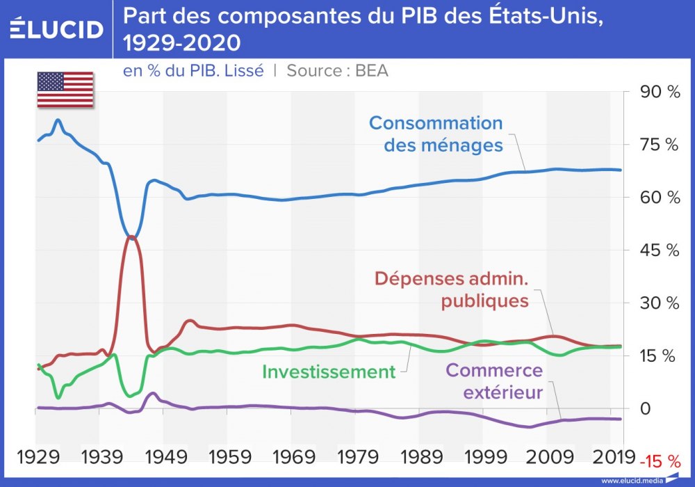 L’analyse des composantes du PIB américain sur le temps long permet de repérer les déterminants de la croissance. On distingue plusieurs tendances :
