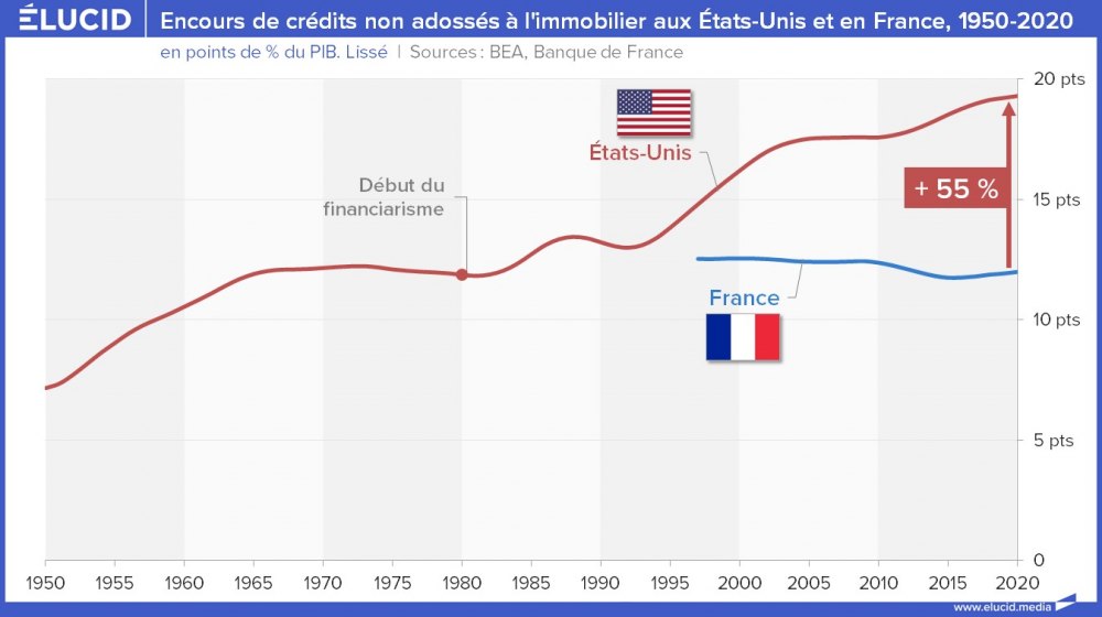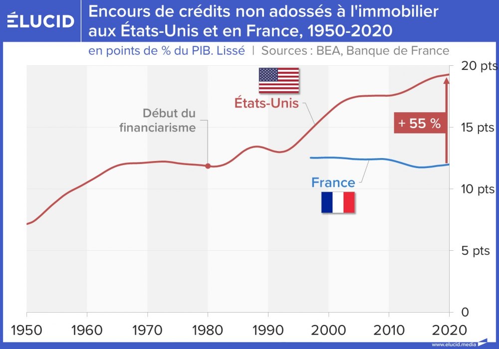 L’augmentation de la part de la consommation des ménages américains dans le PIB à partir de 1980 se perçoit en observant l’évolution de l’encours des crédits non adossés à un bien immobilier aux États-Unis. Depuis 1980, sa croissance est supérieure à la croissance du PIB, il est ainsi passé de 12 points de PIB en 1980 à 19,3 points de PIB en 2020, une augmentation de 7,3 points.
