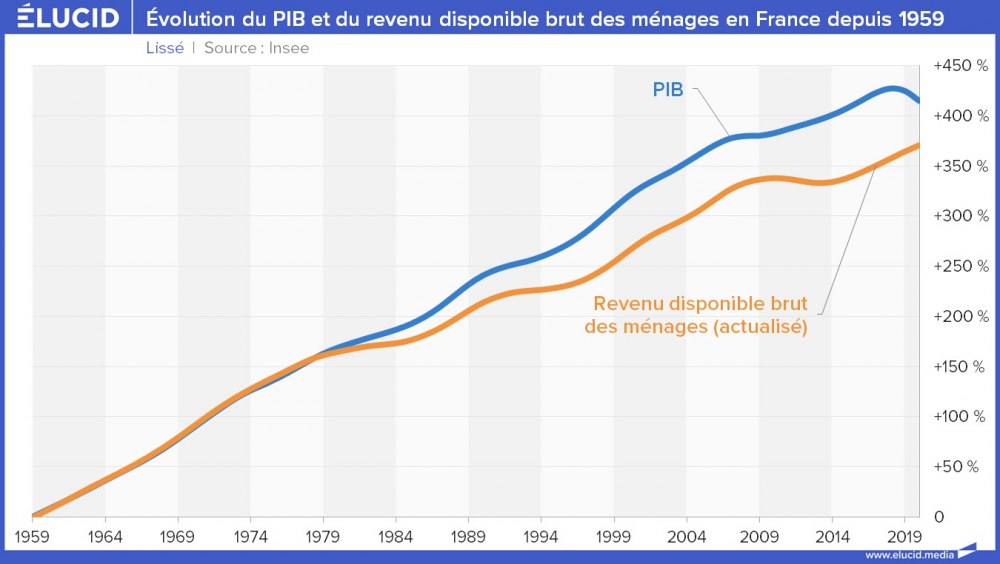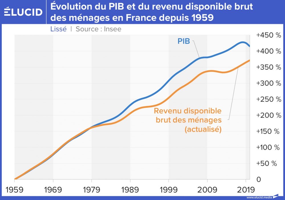 Si les revenus des ménages corrigés de l’inflation, c’est-à-dire le pouvoir d’achat, ont été multipliés par près de 5 depuis 1960, on constate un net ralentissement de cette tendance sur la période récente. Depuis les années 1980 et encore plus fortement depuis la crise de 2008, le pouvoir d’achat global des ménages augmente bien moins fortement : alors qu’avant 1980 il augmentait régulièrement de plus de 3 % par an, cette valeur est tombée à 1,5 % depuis 1980 et même moins de 1 % de hausse depuis 2008 – en moyenne pour l’ensemble des ménages.
