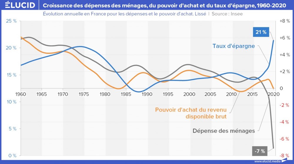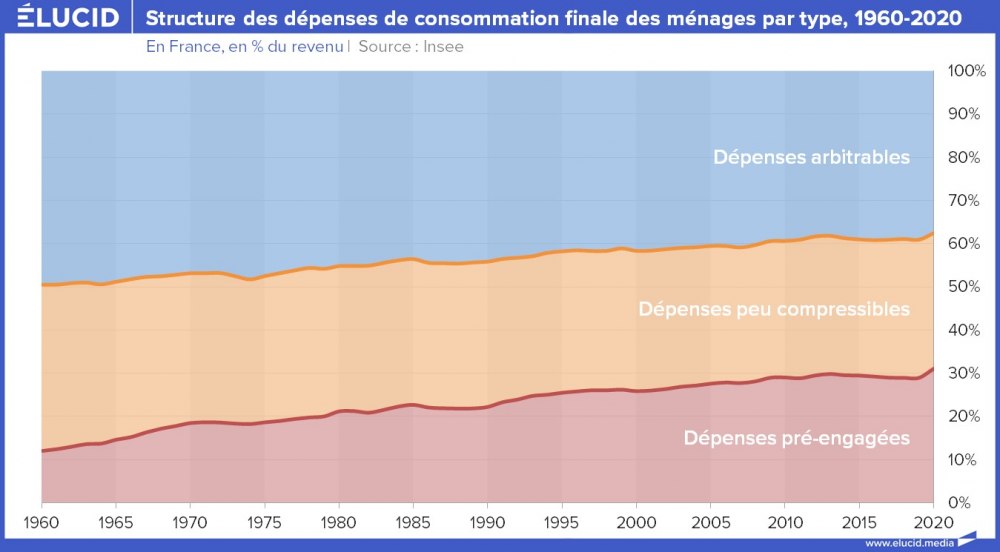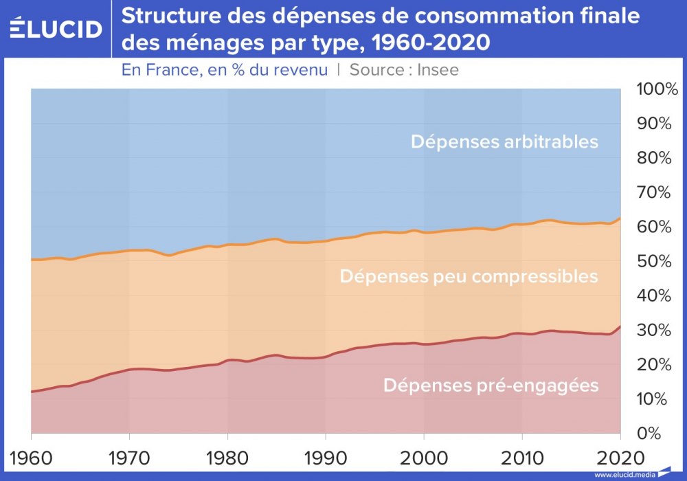 Les dépenses compressibles, qui renferment les dépenses d’habillement, d’ameublement, mais aussi et surtout de loisir (dépenses culturelles, sorties…) et l’achat de services divers sont en fort recul sur la période 1960-2020. Or ces dépenses constituent le pouvoir d'achat arbitrable qui permet un réel ajustement de la consommation aux évolutions des revenus des ménages. Ce que les ménages peuvent donc librement choisir de consommer ou non s’est réduit fortement depuis 1960.