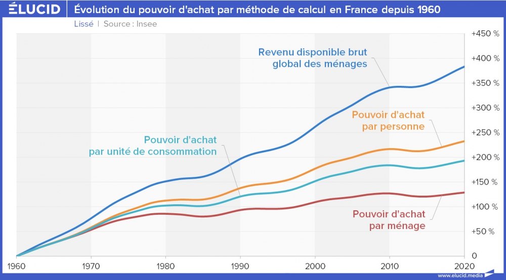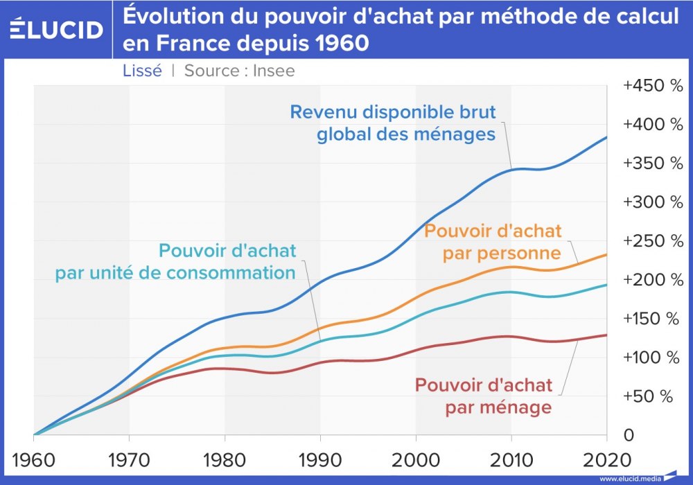 Un premier moyen d’appréhender plus justement le ressenti des Français en matière de pouvoir d’achat est de calculer ce dernier en tenant compte des unités de consommation, c’est-à-dire en tenant compte des besoins de consommation de chaque individu (un adulte consommant plus qu’un adolescent ou un enfant). Depuis 1960, le pouvoir d’achat d’une unité de consommation a été multiplié par 3 contre près de 5 pour le revenu total des ménages.