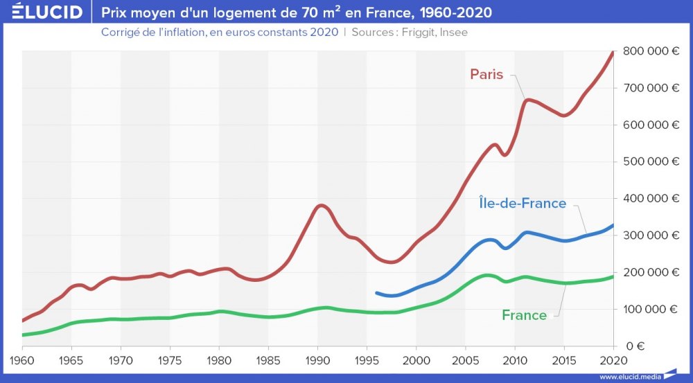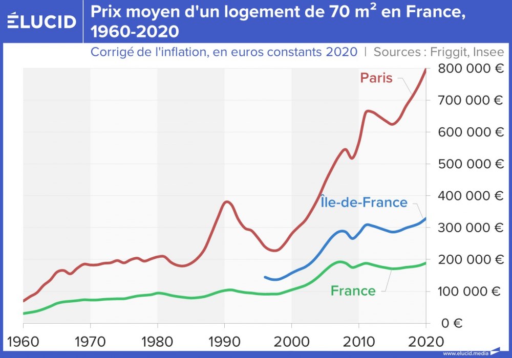 L’INSEE distingue également les dépenses dites « peu compressibles » telles que les dépenses liées à l’alimentation ou la santé. On constate que le poids de ces dépenses a légèrement diminué sur cette période passant de 38 % du budget des ménages à 31 % en 2020. Cette diminution s’explique en partie par la forte baisse des prix alimentaires depuis les 30 glorieuses.