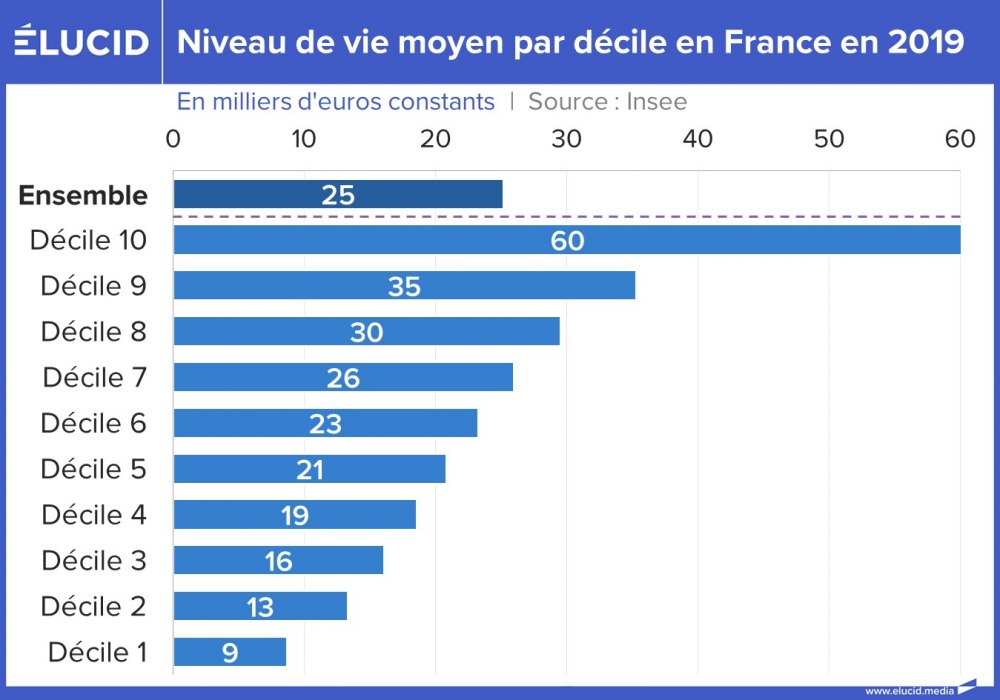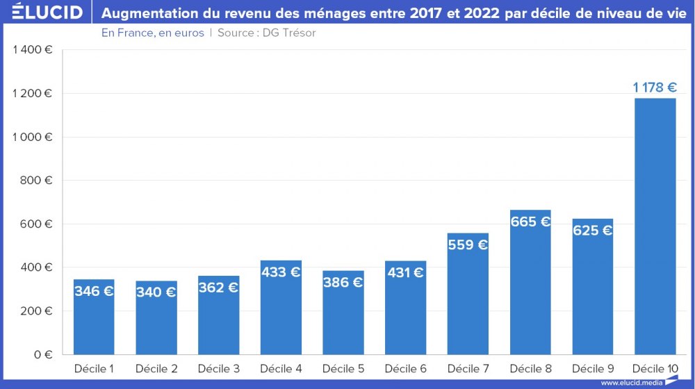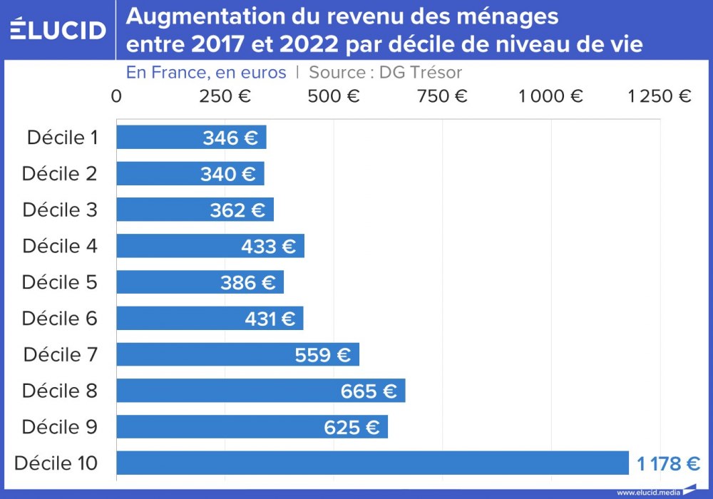 À l’inverse, les ménages des classes moyennes (qui excluent les 10% des Français les plus pauvres et les 10% les plus riches) n’ont vu qu’une progression de 350 à 450 € par ménage.