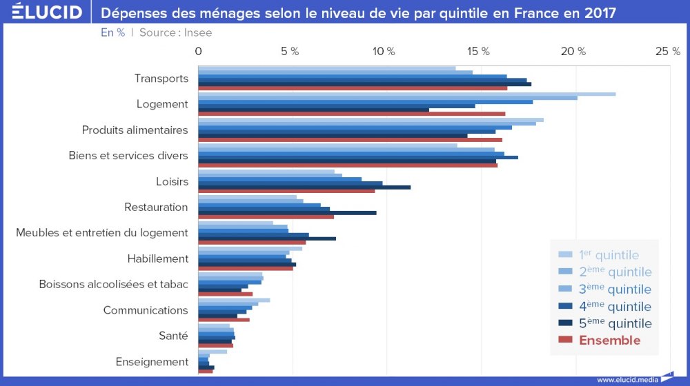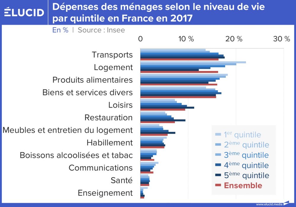 On constate sur le graphique suivant que les 20 % des Français les plus pauvres (1er quintile) consacrent par exemple 22 % de leur revenu aux dépenses de logement et d’énergie contre seulement 12 % pour les 20 % les plus riches (5e quintile).
