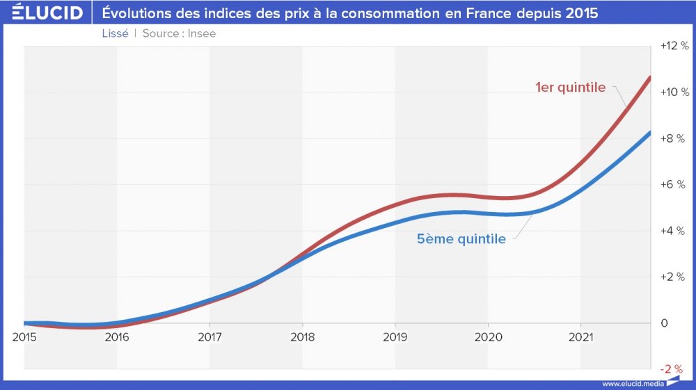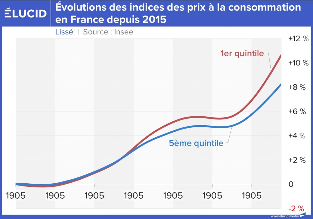 Une inflation plus forte signifiant un pouvoir d’achat réduit, c’est donc une double peine que vivent les classes populaires françaises : d’une part, des revenus faibles, impliquant un pouvoir d’achat arbitrable faible (donc peu d’occasion « de se faire plaisir ») et d’autre part une sensibilité beaucoup plus forte de ces dépenses à l’inflation.
