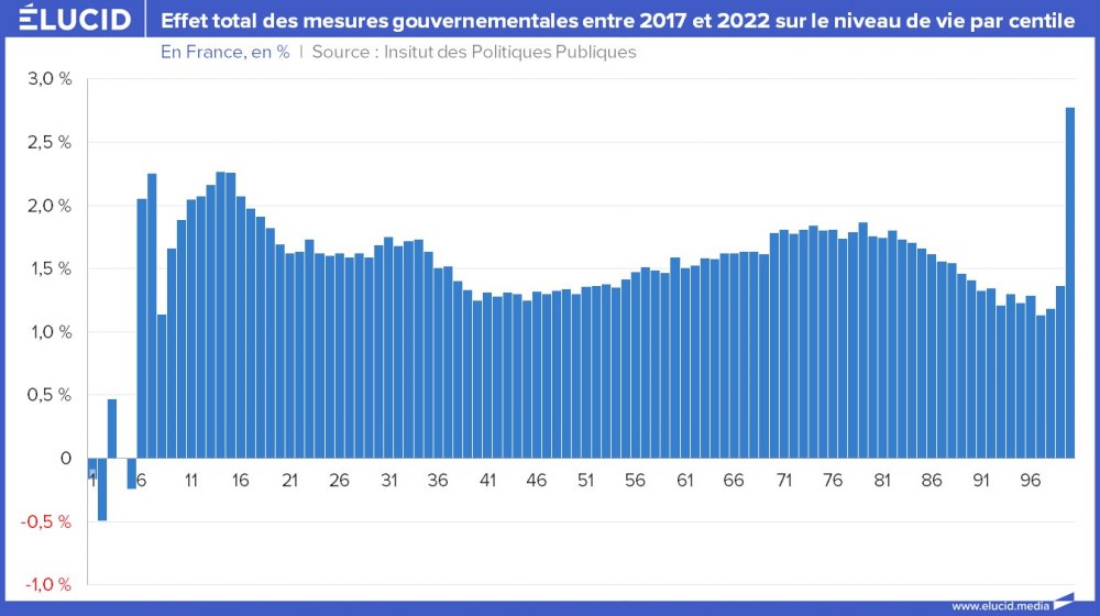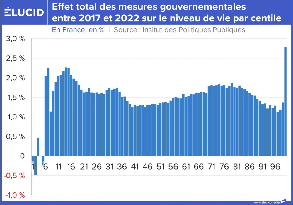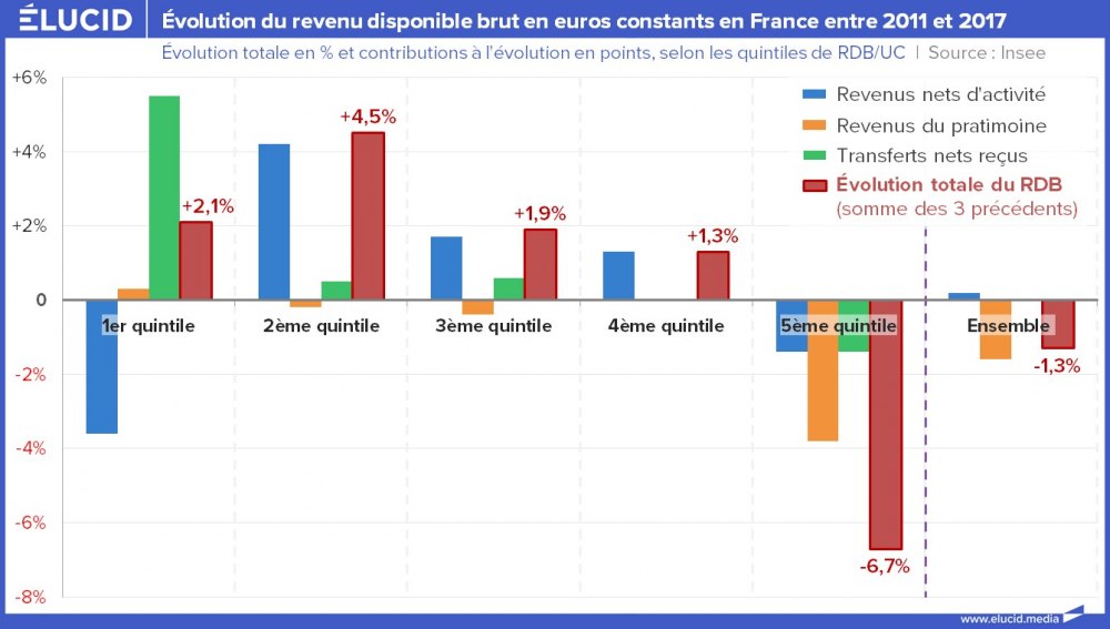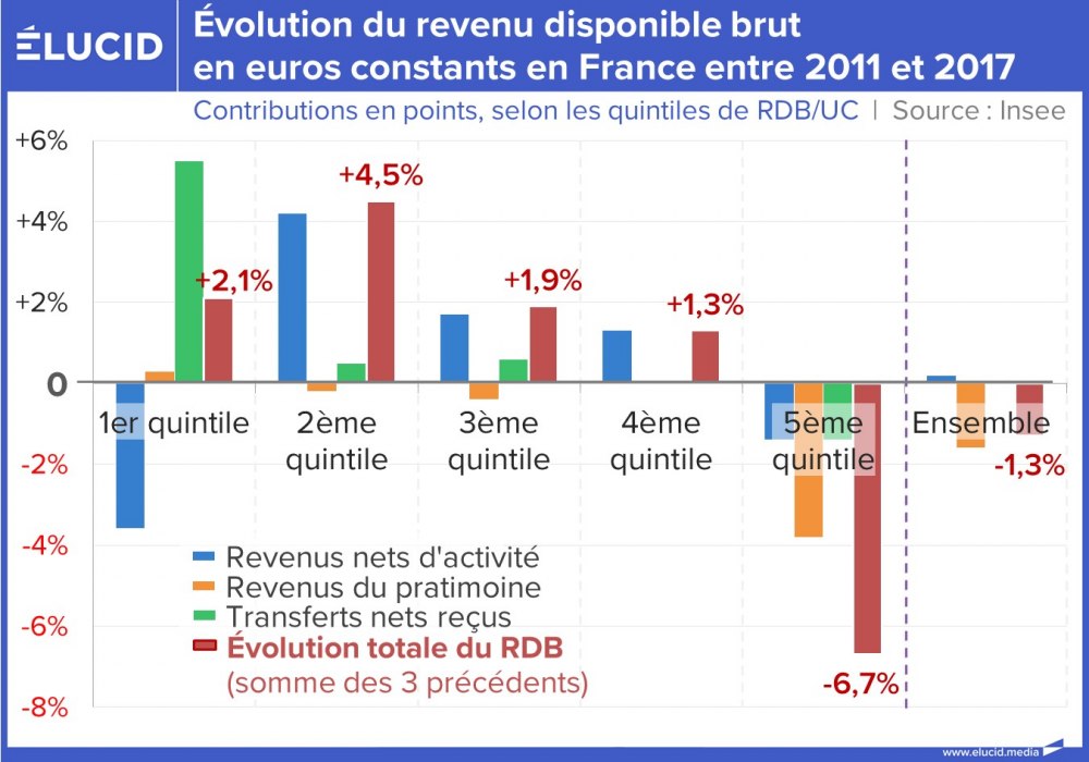 Paradoxalement, ce sont les classes aisées qui ont vu leur pouvoir d’achat fortement baisser entre 2011 et 2017. L’arrivée d’Emmanuel Macron au pouvoir en 2017 est le fruit d’une forme de « populisme » des riches, permettant par les mesures socio-fiscales mises en place de stopper la baisse de leur niveau de vie.