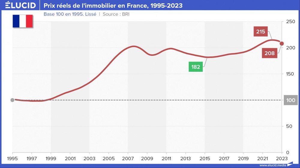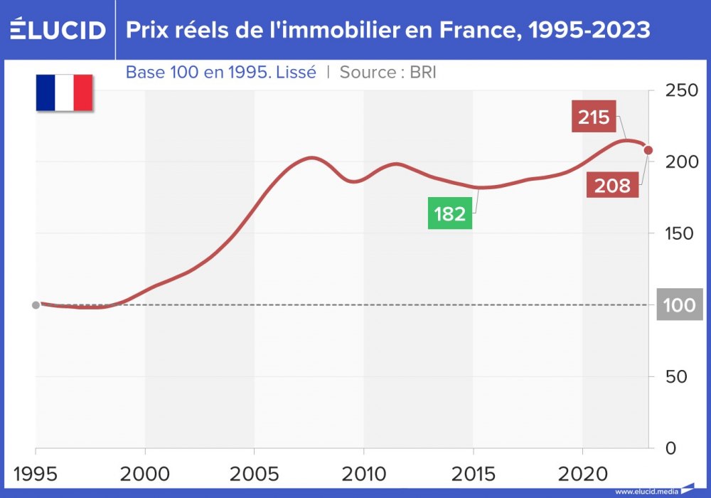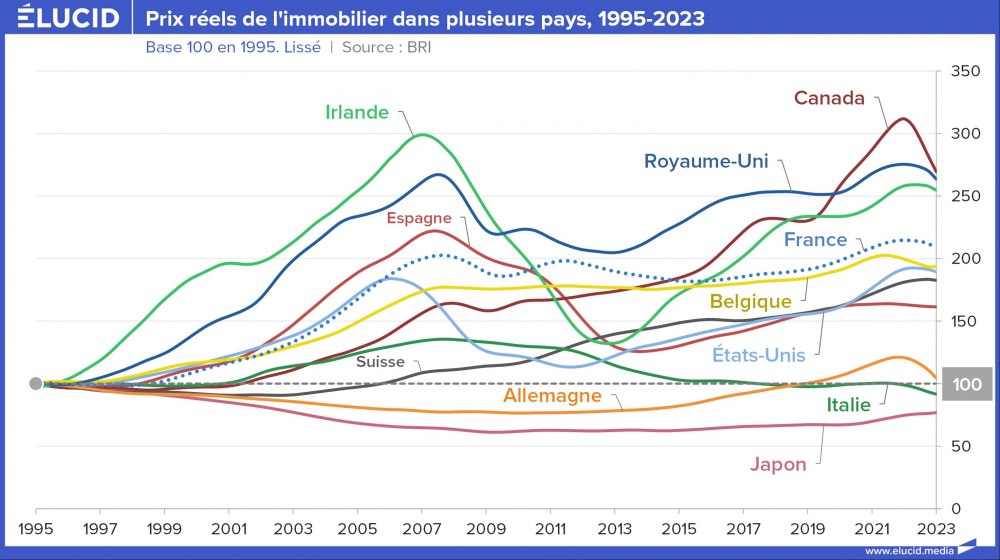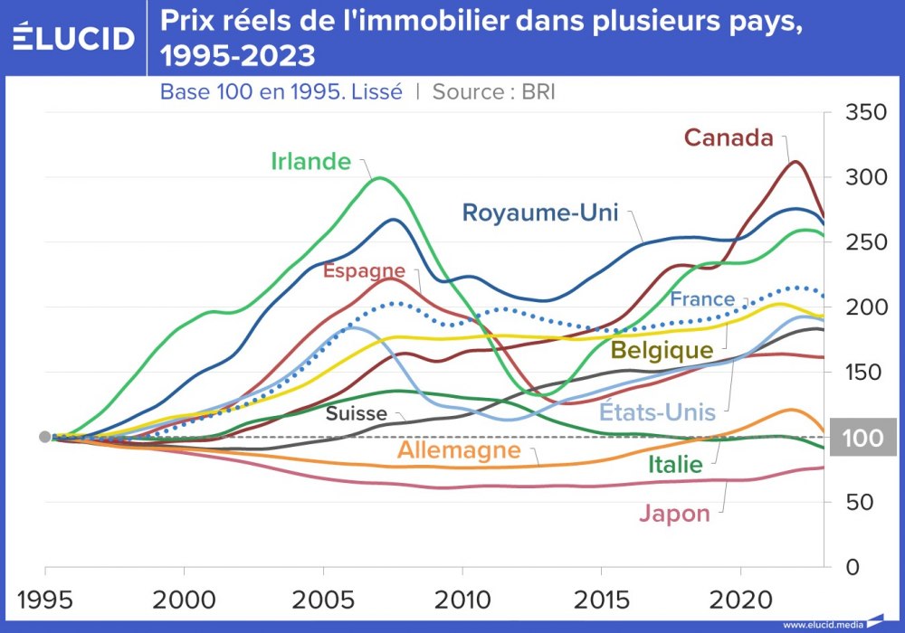 La France a pour sa part connu un doublement des prix immobiliers sur cette même période. Cependant, depuis maintenant un an, ces prix diminuent légèrement et laissent craindre une crise immobilière dans l'hexagone (lire notre analyse sur ce sujet).