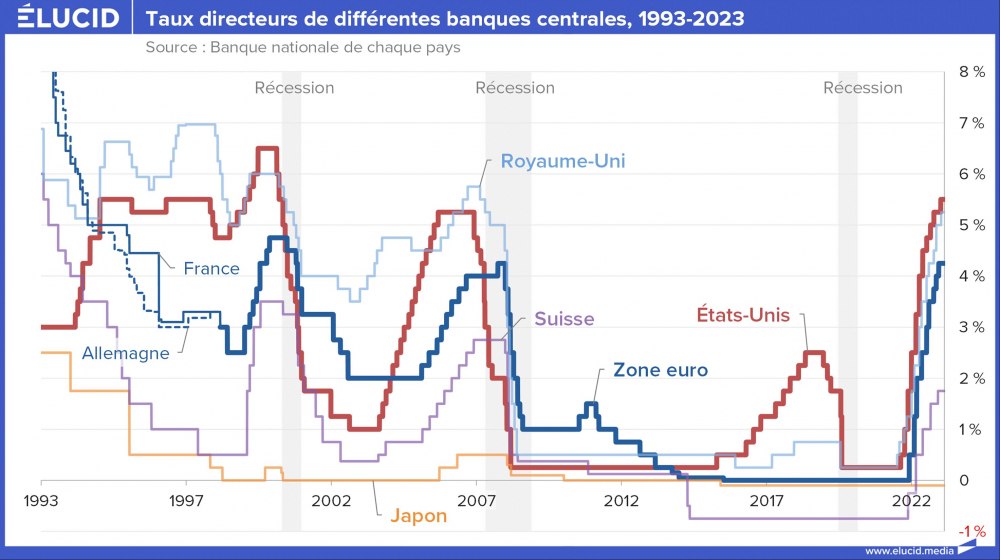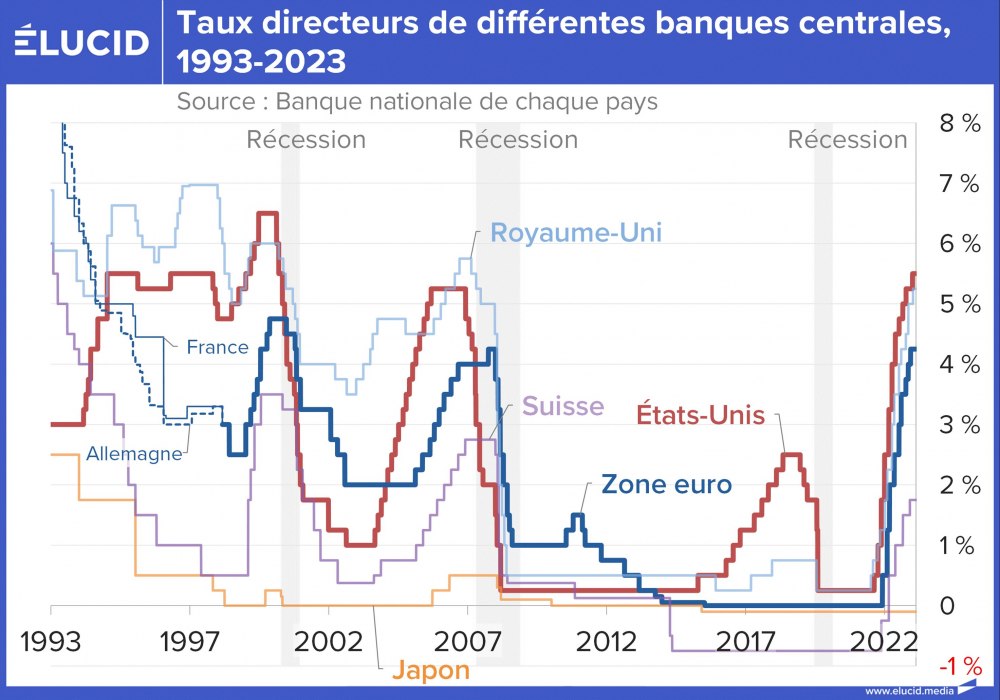 Cette forte hausse des taux est quant à elle causée par la hausse de l’inflation, une situation somme toute logique, puisque dans une économie saine, le taux d’intérêt doit normalement être environ 1 % supérieur à l’inflation. Par exemple, si le taux réel est négatif (comme c’est toujours le cas), les emprunteurs s’enrichissent sans cause, et les inégalités augmentent par rapport à la moitié de la population trop pauvre pour s’endetter (sans même parler de l’enrichissement sans cause due à la hausse des prix alimentée par la baisse des taux).
