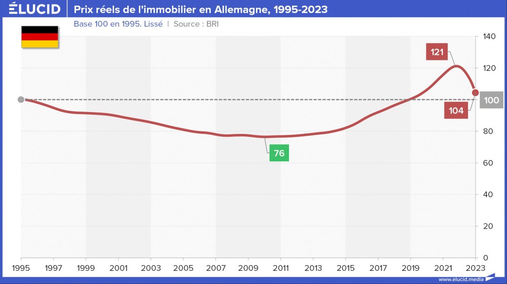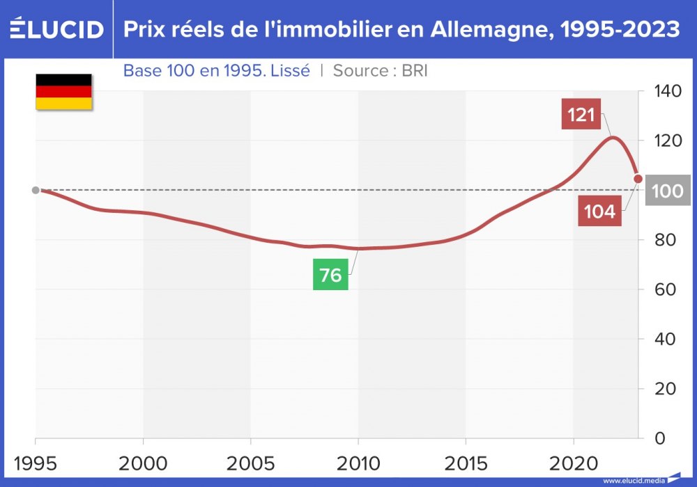 Cependant, à partir de 2012, la tendance s'est inversée et les prix de l’immobilier sont partis à la hausse, jusqu'à dépasser en 2019 leur niveau de 1995. Cette hausse des prix s'est poursuivie jusqu’en 2022, poussée par la politique de taux bas de la BCE. Mais le retour de l’inflation et la hausse des taux induite ont récemment cassé ce mouvement : les prix réels ont depuis fortement baissé en Allemagne, d’environ 15 %.