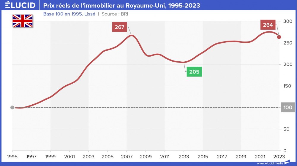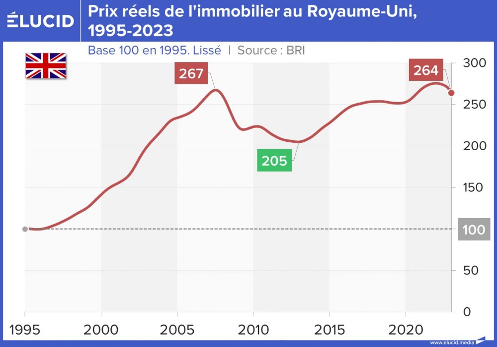 Le Royaume-Uni est le pays d’Europe où le prix de l’immobilier est le plus élevé : il s’établissait en 2020 à un niveau presque trois fois supérieur à celui de 1995. Après une baisse entre 2008 et 2013, les prix sont fortement repartis à la hausse avec la baisse des taux, jusqu’en 2022, où ils ont recommencé à baisser légèrement.