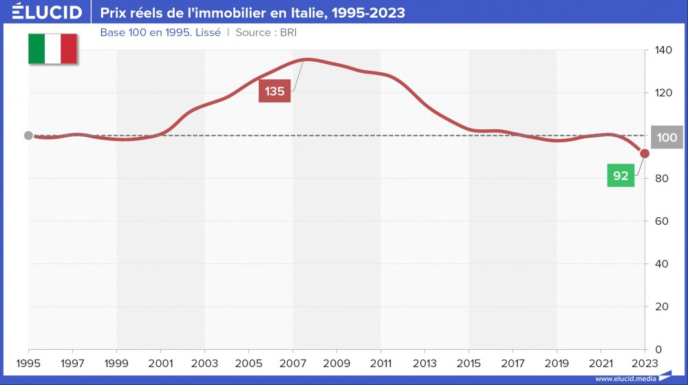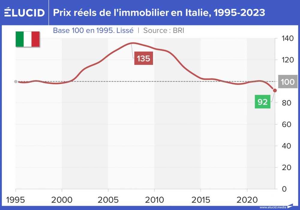 Comme dans la plupart des pays, la crise de 2008 avait mis fin à une augmentation continue des prix de l’immobilier italiens, entamée à partir du début des années 2000. Mais alors que la chute généralisée des prix de l’immobilier au lendemain de la crise des subprimes s’est arrêtée entre 2011 et 2013 dans la plupart des pays d’Europe, elle s’est prolongée en Italie jusqu’en 2019, de sorte que les prix ont chuté de près de 30 %.