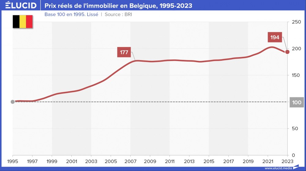 L’évolution des prix de l’immobilier belge a connu trois phases sur ces 25 dernières années : une période de forte hausse entre 1995 et 2007, puis une grande stabilité jusqu’en 2021, et enfin une baisse modérée depuis 2022. Sur la totalité de la période, les prix ont ainsi doublé, tout comme en France.