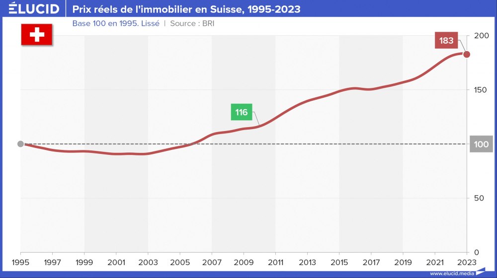 Les prix de l’immobilier suisse ont augmenté de façon linéaire depuis 2006, et se situent aujourd’hui 80 % au-dessus des prix en vigueur en 1995. Comme en Belgique, la crise des subprimes n’a pas engendré de chute du prix de l’immobilier.