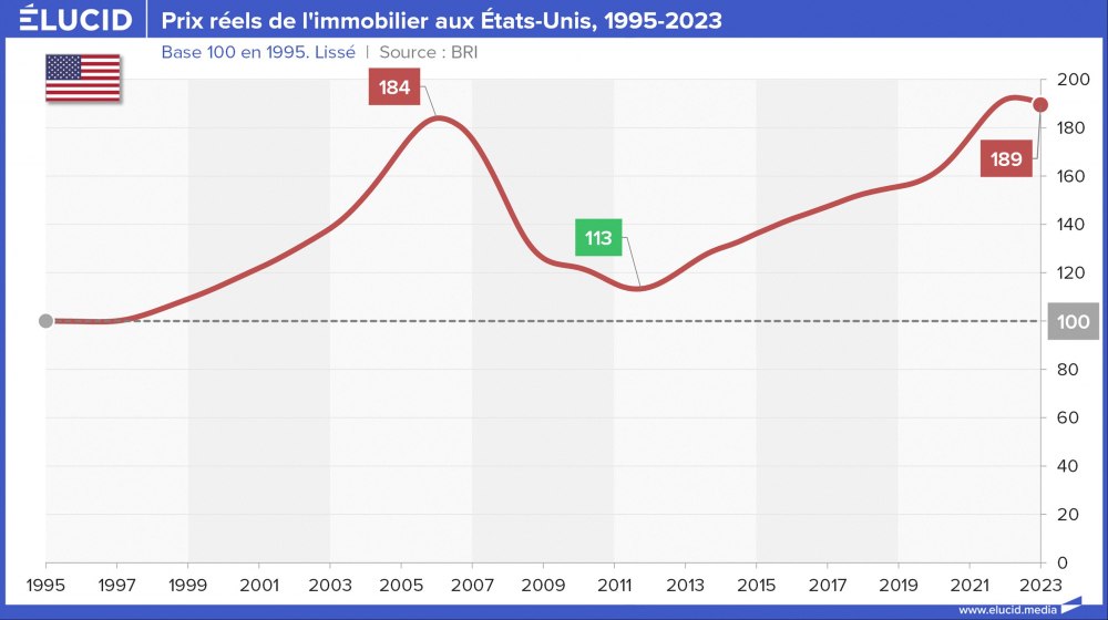 La caractéristique majeure de l’évolution récente des prix de l’immobilier aux États-Unis est le dégonflement rapide de la bulle immobilière après la crise des subprimes, puis sa réémergence au cours des années suivantes. En effet, avec la crise, les prix de l’immobilier américains avaient pratiquement retrouvé leur niveau de 1995, après une forte chute entre 2006 et 2011. Depuis lors, les prix américains se sont redressés pour atteindre en 2021 un niveau supérieur au pic de 2006.