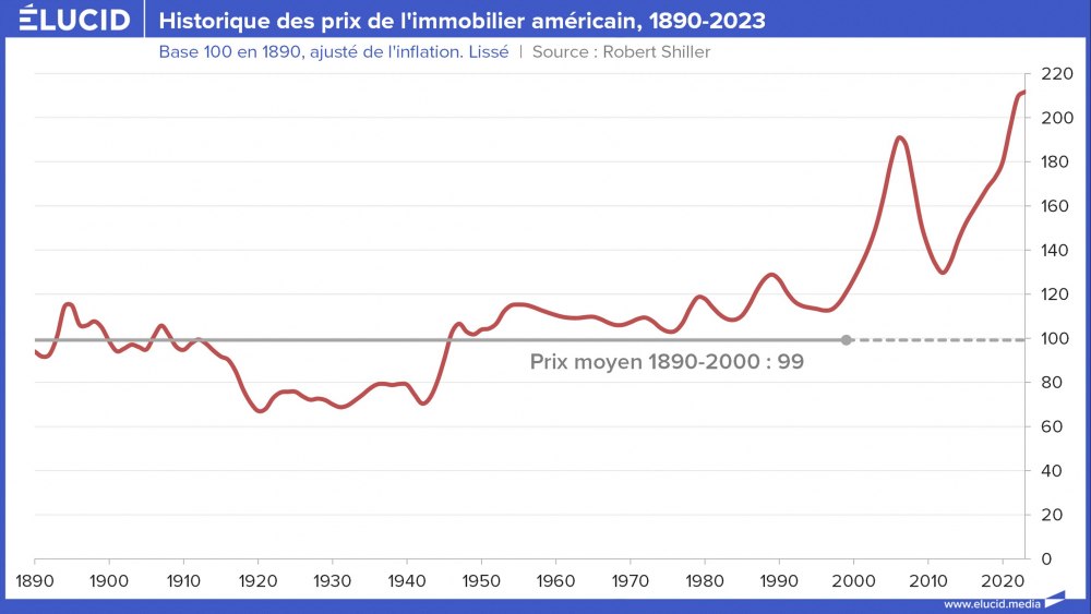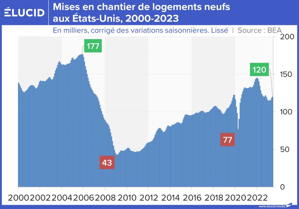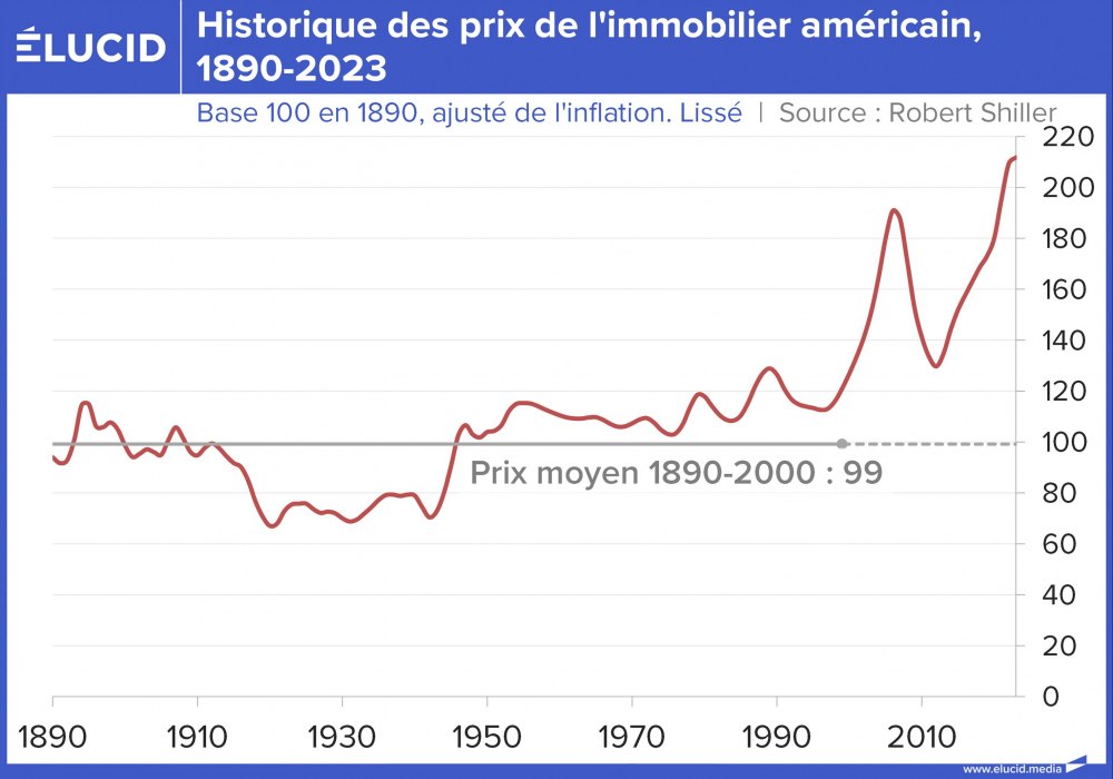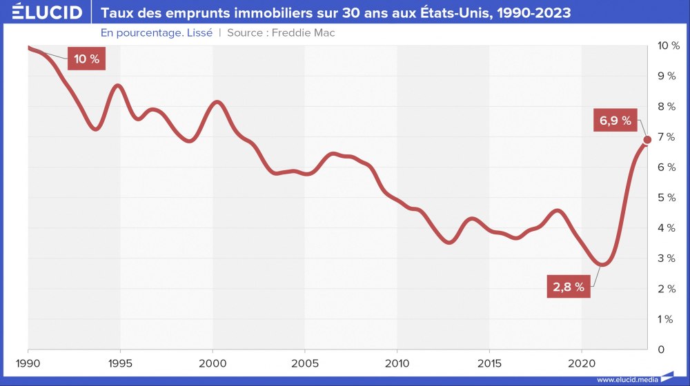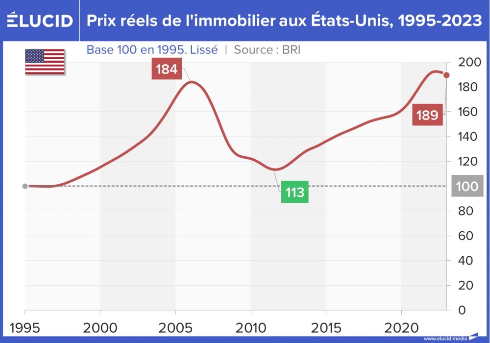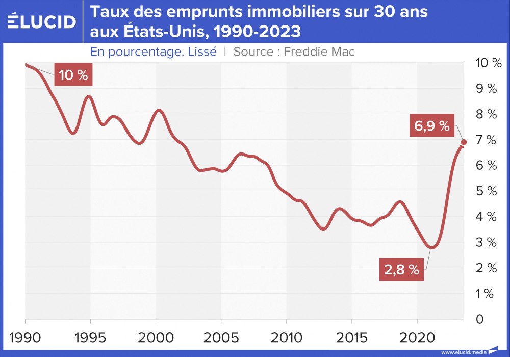 Cette nouvelle hausse des prix américains s'explique par le faible taux des crédits immobiliers (autour de 3 %). Cependant, comme les taux sont revenus à près de 7 % en 2023, il est probable que les prix refluent nettement cette année.